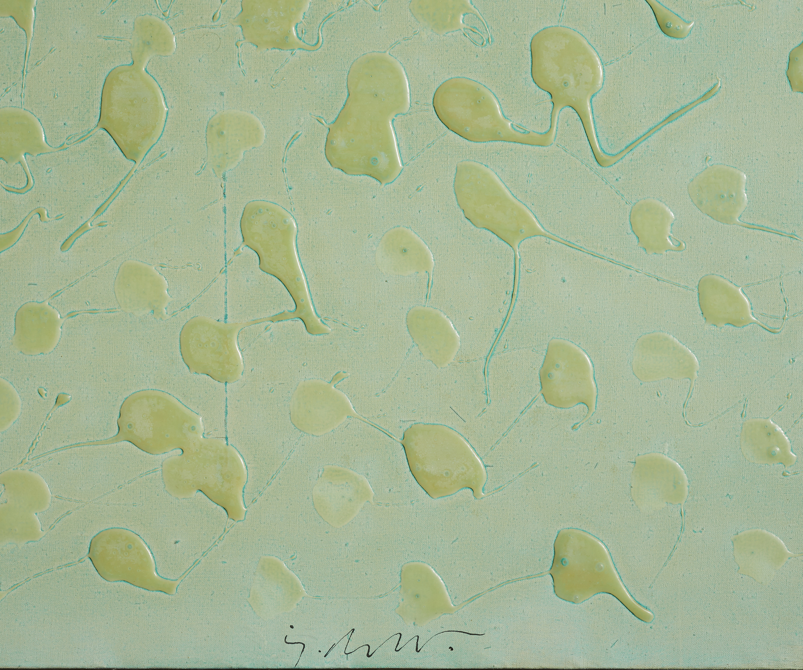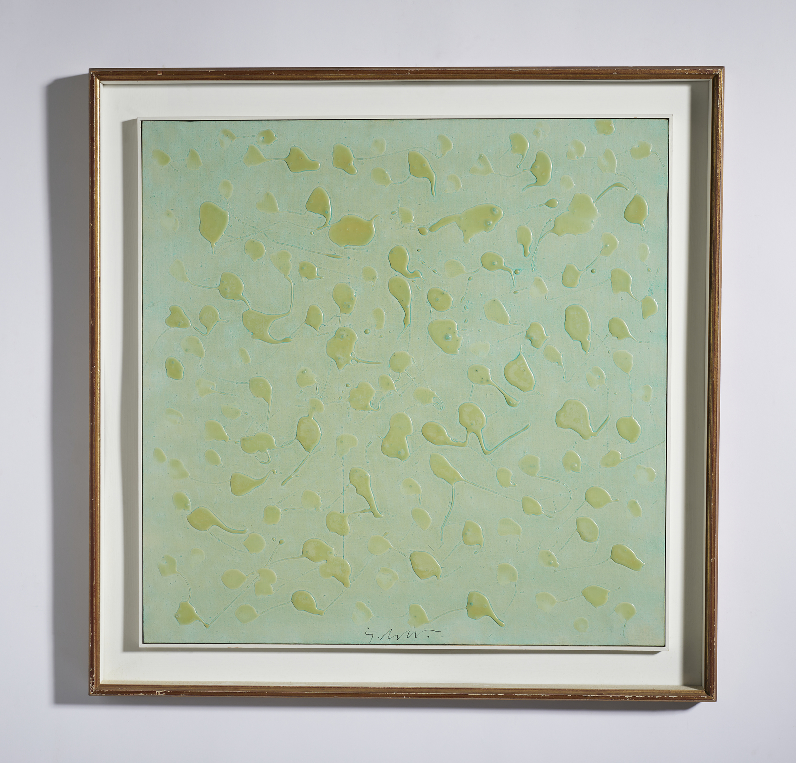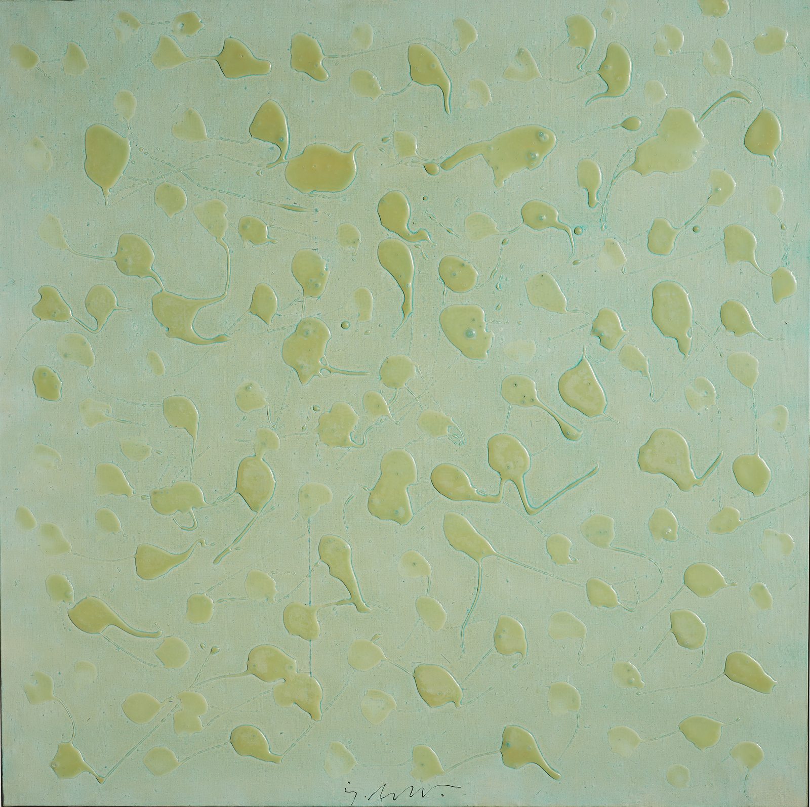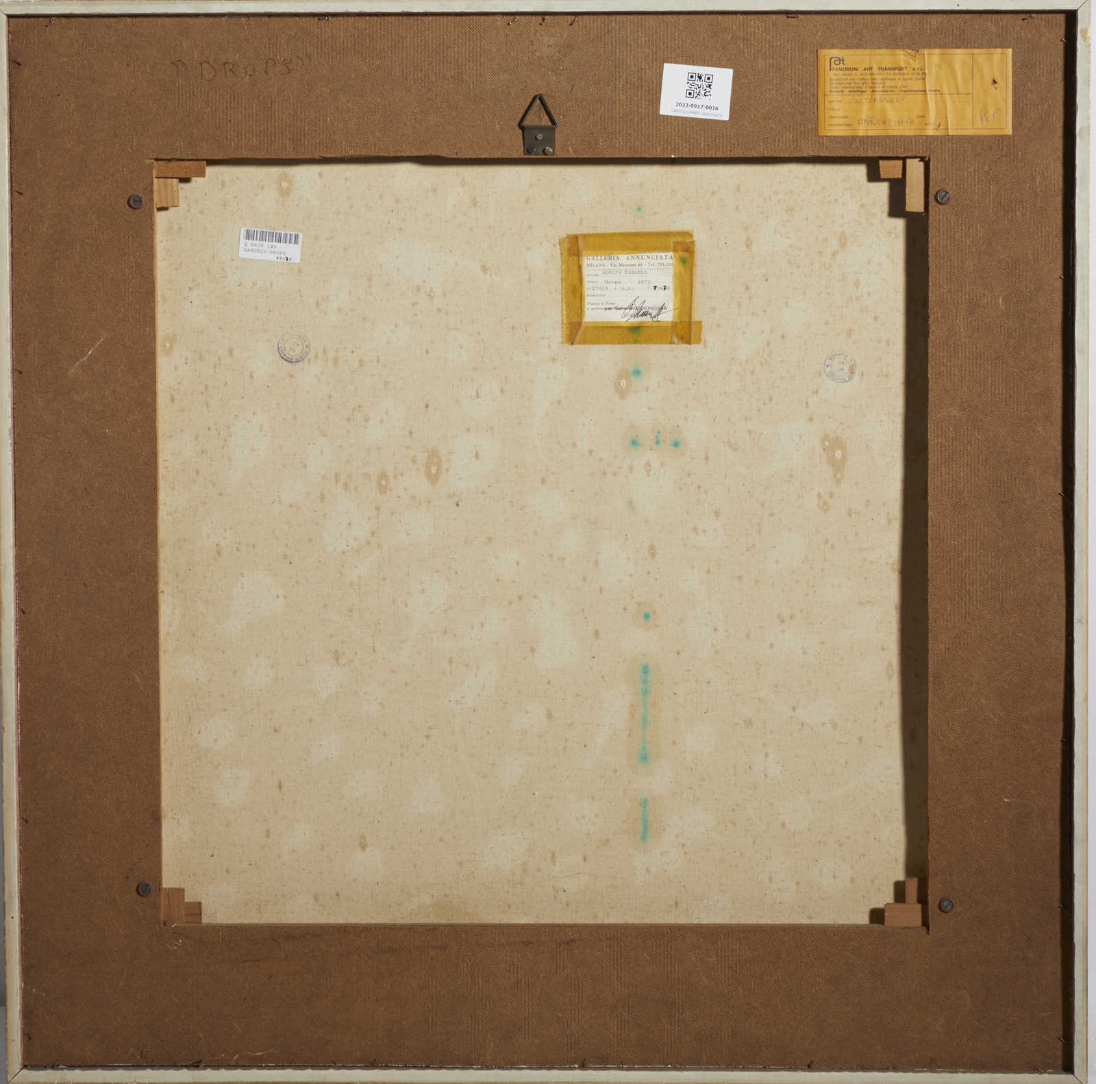 DANGELO SERGIO (1932 - 2022) Drops. Tecnica mista su tela. Cm 70,00 x 70,00. Firma in basso al centro. Al retro cartiglio descrittivo Galleria Annunciata, Milano. Provenienza: Collezione privata, Pavia. Cornice presente