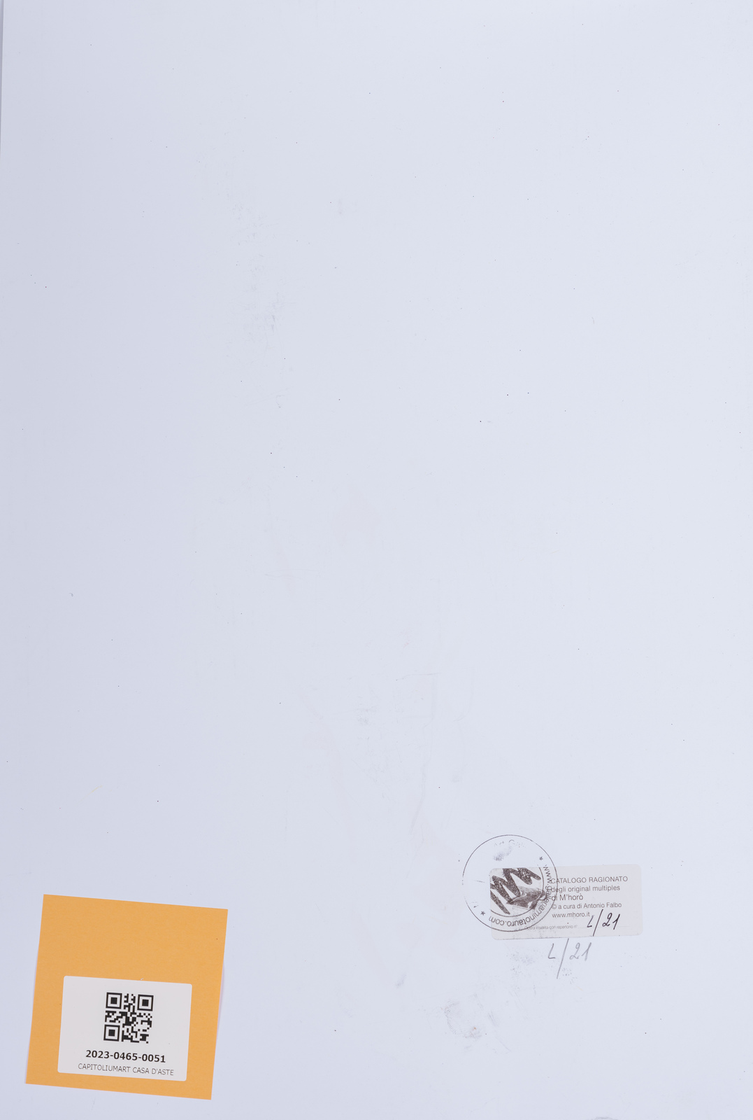 M'HORO' Senza titolo. Tecnica mista e collage su cartoncino. Cm 32,00 x 47,90. L21. Tiratura al retro. Firma in basso a destra a matita. Al retro timbro Minotauro Fine Art Gallery, Palazzolo. Autentica dell'artista. Lievi difetti.