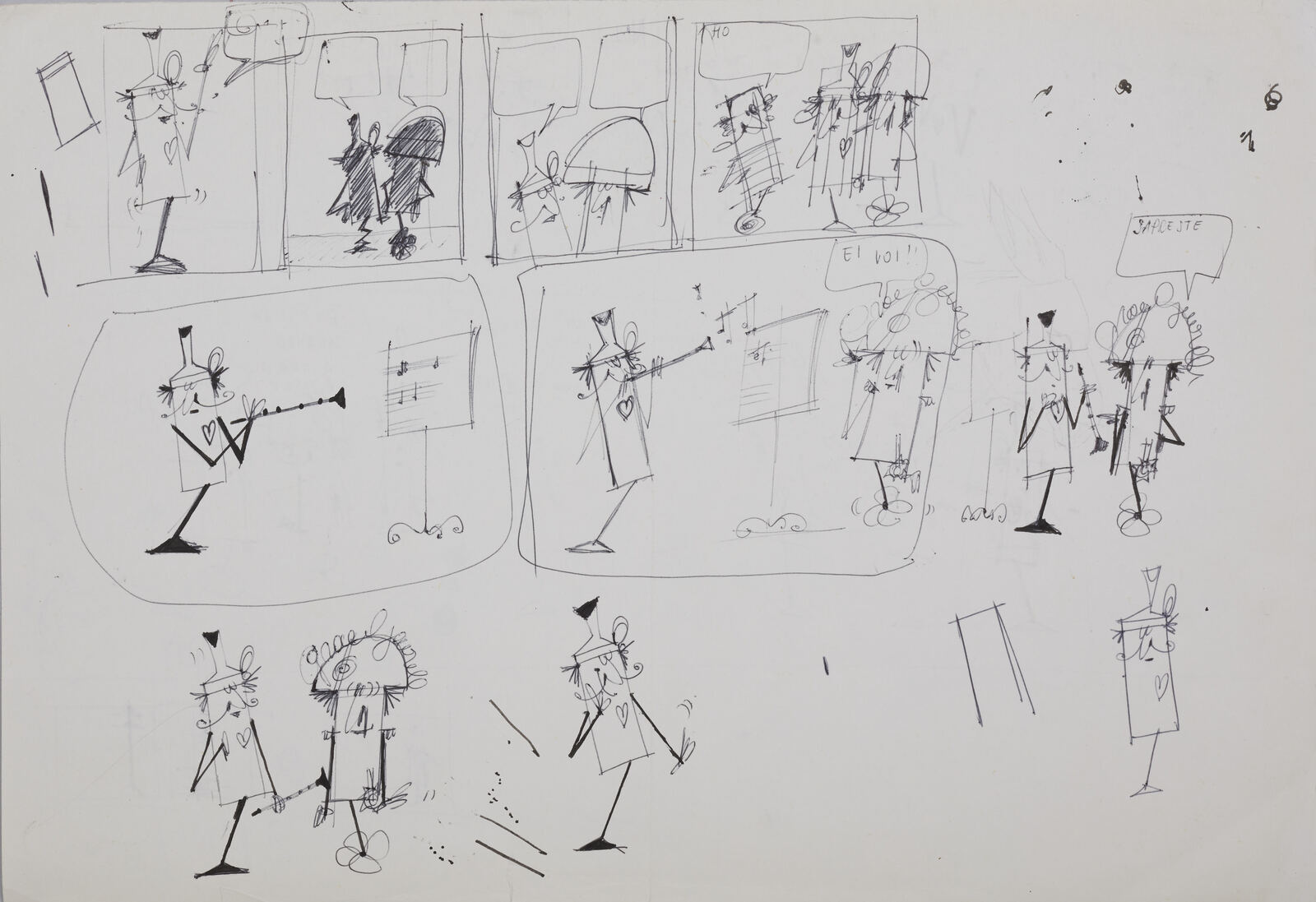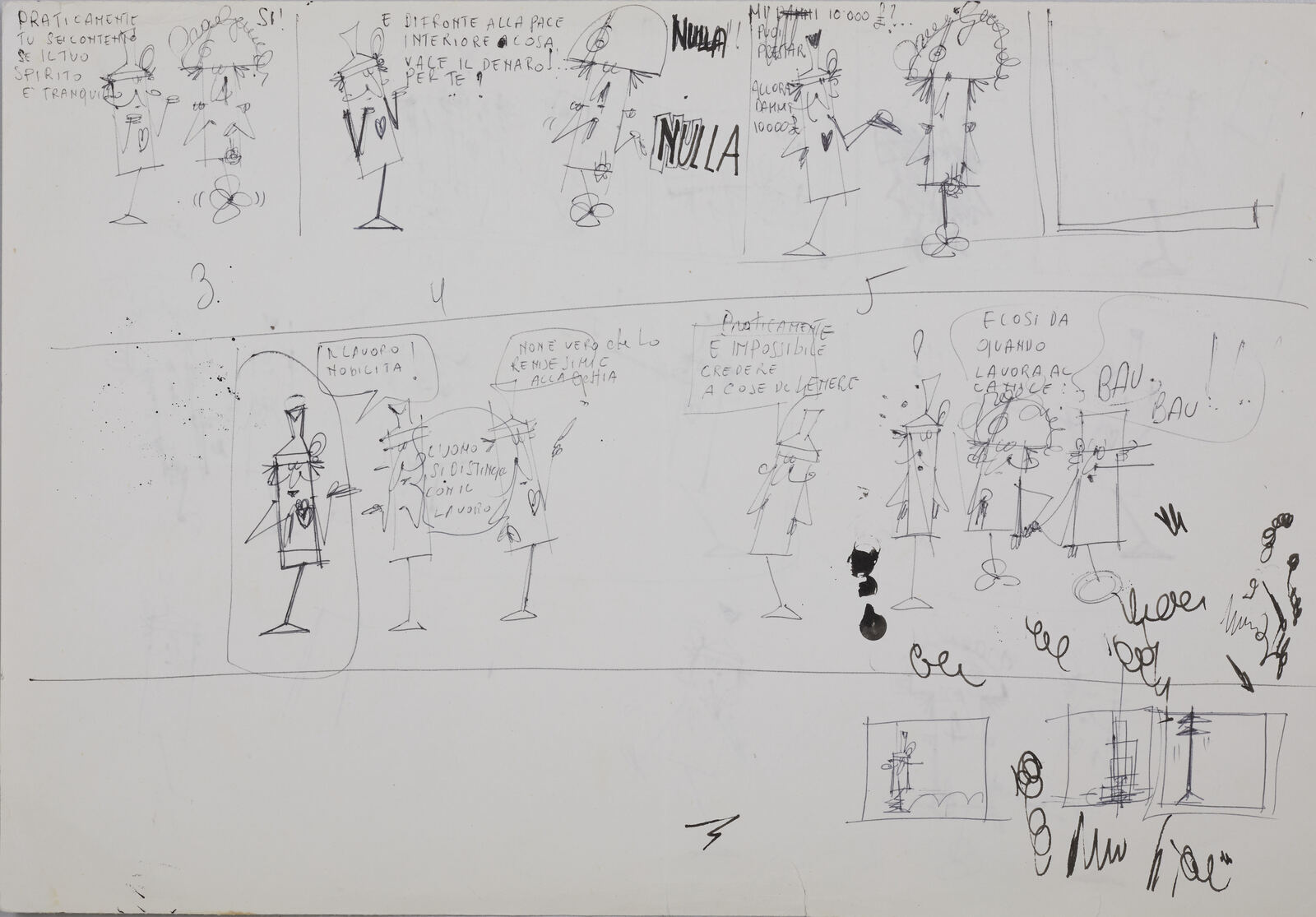 Il lotto proviene dagli archivi dei collaboratori della Lodolo Film, storica società di spot pubblicitari e di animazione italiana nata verso le fine degli anni 50. I Posteros, personaggi di fantasia, primitivi del futuro, nascono dalla collaborazione di Pino Pascali con la Lodolo film nel1958, un anno prima del suo diploma all’Accademia di Belle Arti di Roma; sodalizio che durò sino al 1967. Sandro Lodolo, titolare della casa di produzione pubblicitaria, e Pino Pascali, nel ruolo di creativo, realizzarono innumerevoli spot e cartoons pubblicitari. Gli Intermezzi che videro proprio i Posteros come protagonisti furono eseguiti , sia in bianco e nero che a colori, nel 1962 e nel 1968, anno della morte di Pascali, quando vennero ripresi da Lodolo come studio per i personaggi di un nuovo contenitore pubblicitario del secondo programma della Rai.