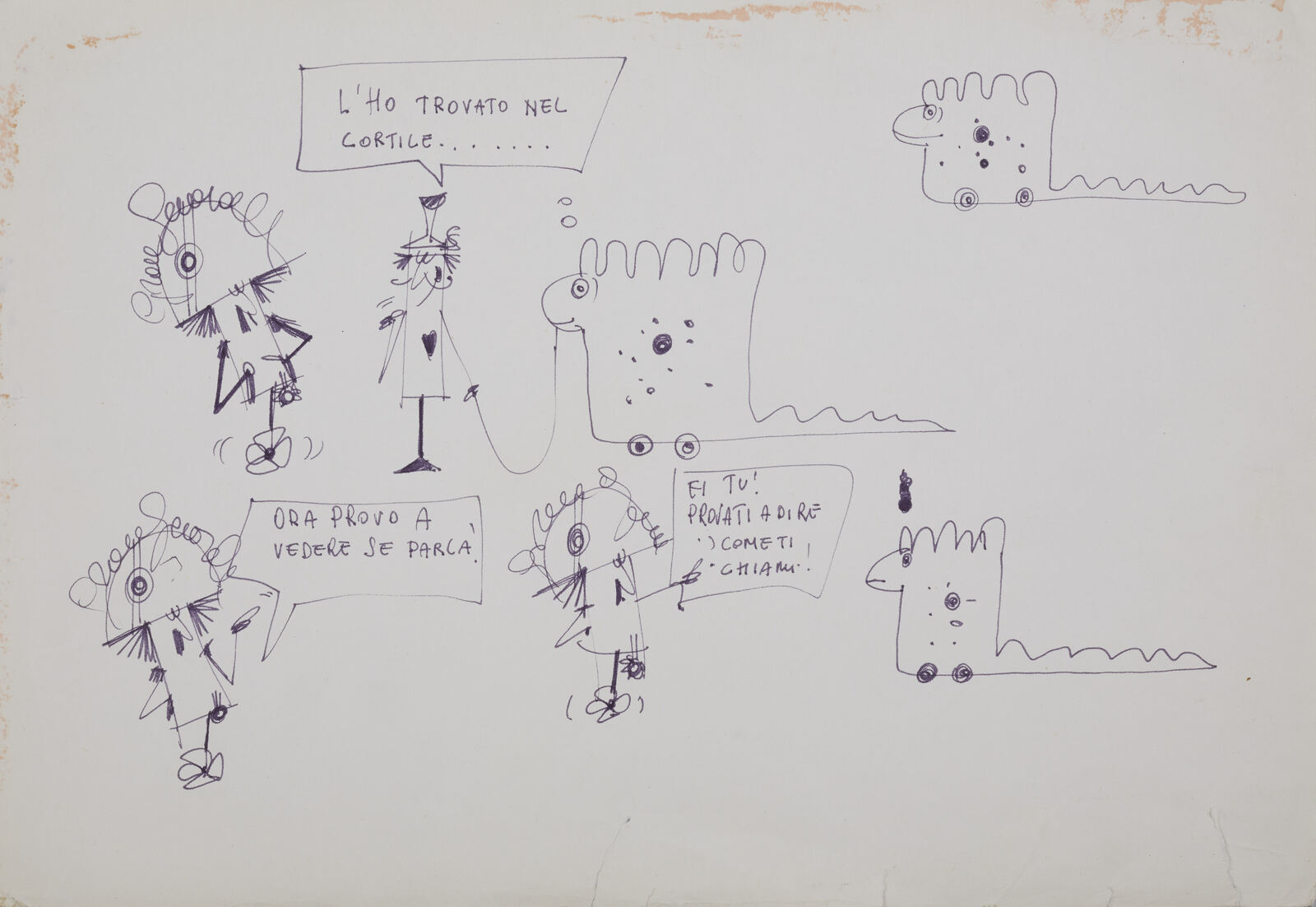 LODOLO FILM Della serie Sketches dei Posteros . Tecnica mista su cartoncino. Cm 35,00 x 24,00. Il lotto proviene dagli archivi dei collaboratori della Lodolo Film, storica società di spot pubblicitari e di animazione italiana nata verso le fine degli anni 50. I Posteros, personaggi di fantasia, primitivi del futuro, nascono dalla collaborazione di Pino Pascali con la Lodolo film nel1958, un anno prima del suo diploma all’Accademia di Belle Arti di Roma; sodalizio che durò sino al 1967. Sandro Lodolo, titolare della casa di produzione pubblicitaria, e Pino Pascali, nel ruolo di creativo, realizzarono innumerevoli spot e cartoons pubblicitari. Gli Intermezzi che videro proprio i Posteros come protagonisti furono eseguiti , sia in bianco e nero che a colori, nel 1962 e nel 1968, anno della morte di Pascali, quando vennero ripresi da Lodolo come studio per i personaggi di un nuovo contenitore pubblicitario del secondo programma della Rai.