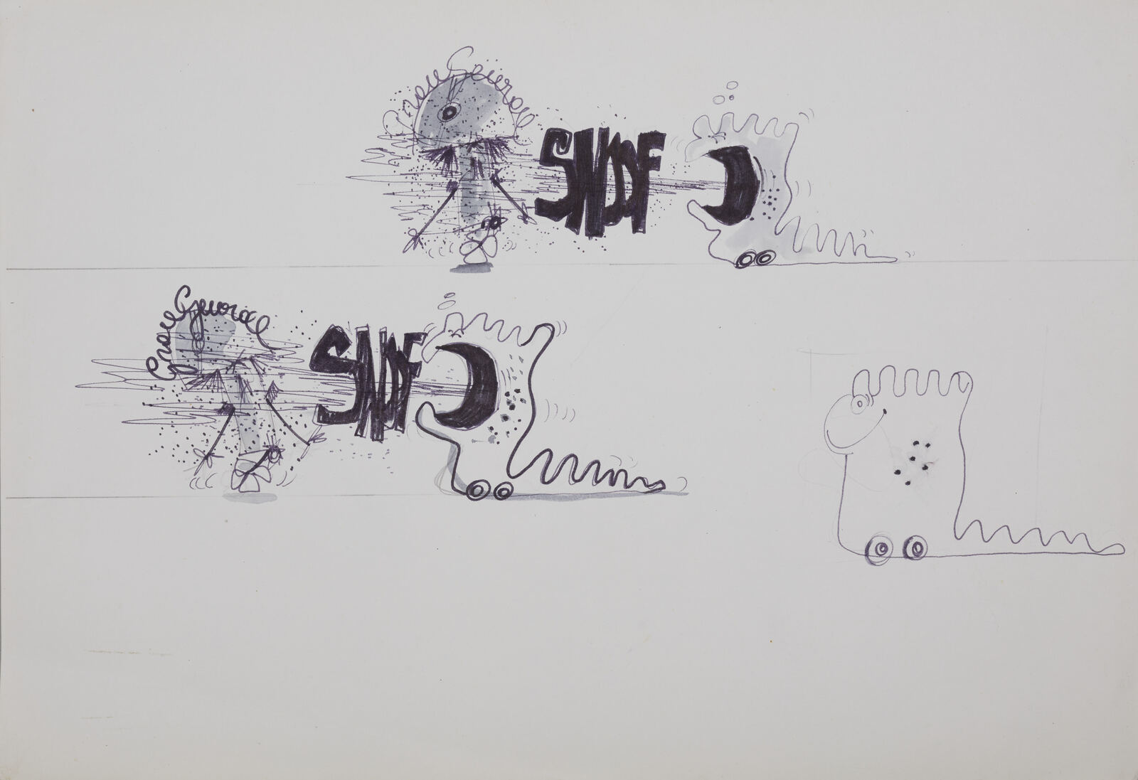 LODOLO FILM Della serie Sketches dei Posteros . Tecnica mista su cartoncino. Cm 35,00 x 24,00. Il lotto proviene dagli archivi dei collaboratori della Lodolo Film, storica società di spot pubblicitari e di animazione italiana nata verso le fine degli anni 50. I Posteros, personaggi di fantasia, primitivi del futuro, nascono dalla collaborazione di Pino Pascali con la Lodolo film nel1958, un anno prima del suo diploma all’Accademia di Belle Arti di Roma; sodalizio che durò sino al 1967. Sandro Lodolo, titolare della casa di produzione pubblicitaria, e Pino Pascali, nel ruolo di creativo, realizzarono innumerevoli spot e cartoons pubblicitari. Gli Intermezzi che videro proprio i Posteros come protagonisti furono eseguiti , sia in bianco e nero che a colori, nel 1962 e nel 1968, anno della morte di Pascali, quando vennero ripresi da Lodolo come studio per i personaggi di un nuovo contenitore pubblicitario del secondo programma della Rai.