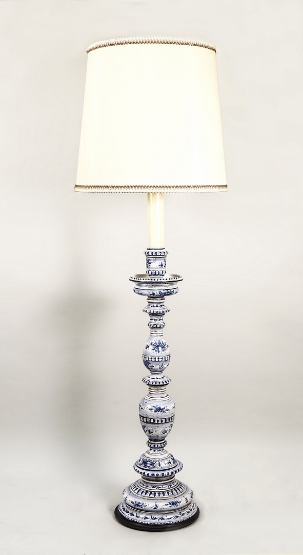 PIANTANA IN CERAMICA - CERAMIC FLOOR LAMP dipinta in monocromia blu, fusto tornito, corredata da paralume h cm 103