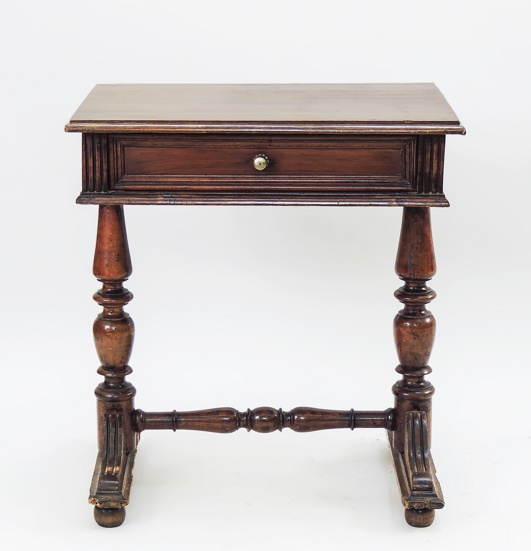 TAVOLINO IN NOCE - SMALL WALNUT TABLE XX secolo - 20th Century un cassetto nella fascia, gambe tornite riunite da traversa, piedini a palla schiacchiata, difetti h cm 64x59x41