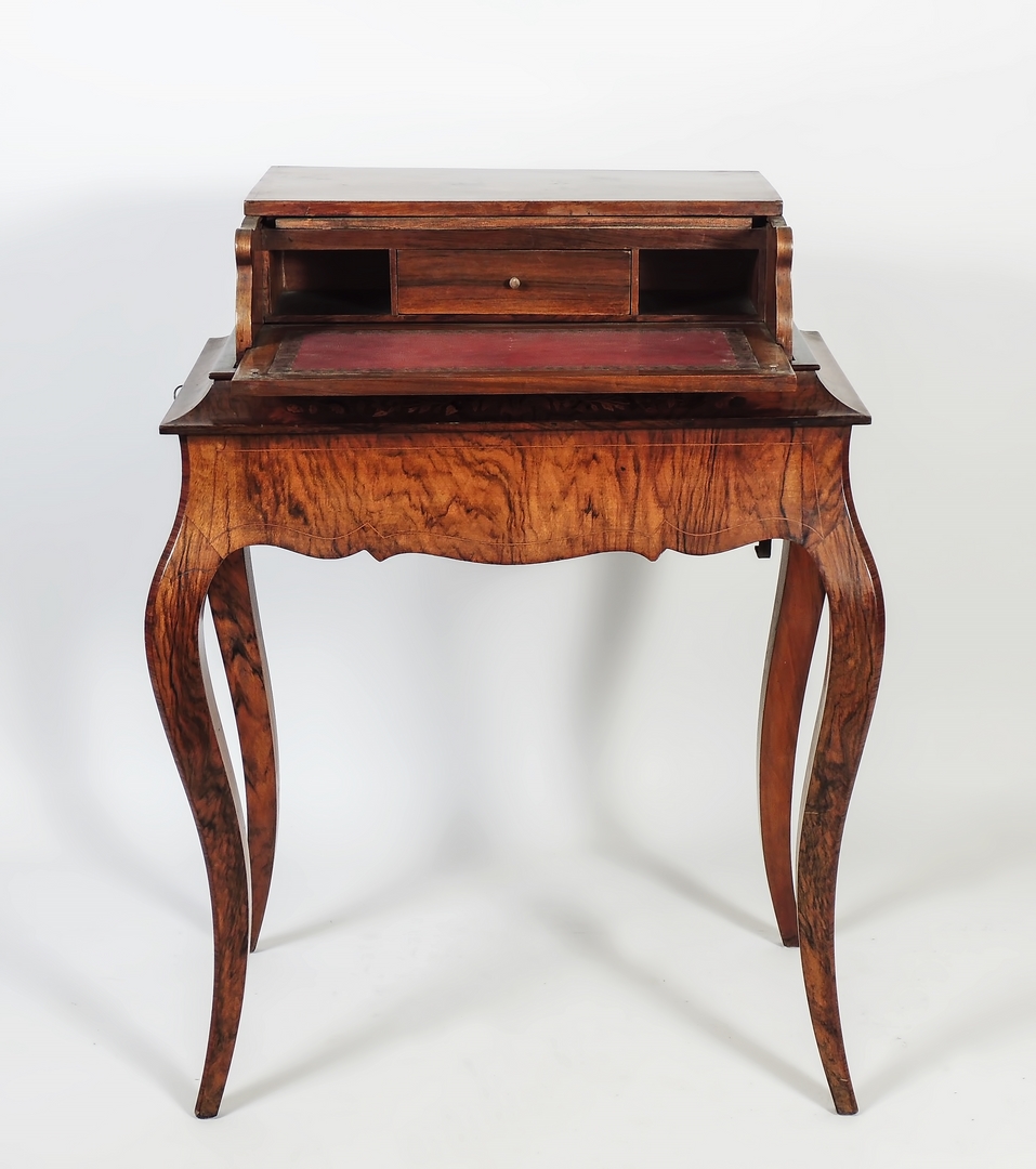 TAVOLINO-SCRITTOIO IN RADICA DI NOCE - SMALL BURR WALNUT WRITING TABLE fine del XIX/inizio del XX secolo - late 19th/early 20th Century intarsiato a motivi floreali in legni di frutto, alzata a scarabattolo a scomparsa con un cassettino, tiretto, pendaglina sagomata, gambe mosse h cm 88x67x42