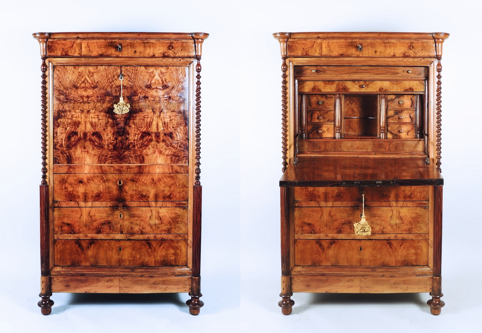 SECRETAIRE IMPIALLACCIATO IN RADICA E PIUMA DI NOCE - BURR AND WALNUT VENEERED CABINET ON CHEST metà del XIX secolo - mid 19th Century cappello lobato con un cassetto sottostante, sportello a calatoio a celare scarabattolo architettonico in parte intarsiato e con segreti, tre cassetti sottostanti, lesene a torciglione e colonna scanalata, piedi a rocchetto h cm 150x84x38