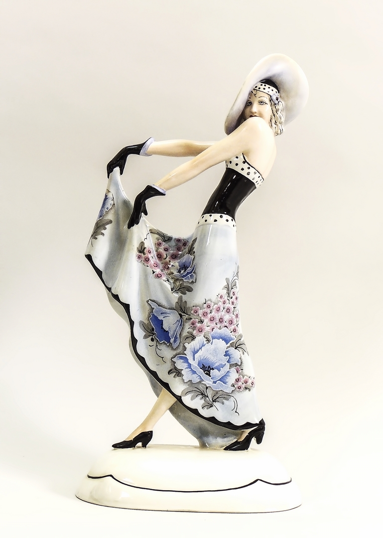 GRUPPO IN CERAMICA POLICROMA - CERAMIC FIGURAL GROUP Vienna, Goldscheider, Anni Settanta - Wien, 70s raffigurante fanciulla vestita in stile retrò con ampia gonna fiorita e cappello nell'atto di danzare h cm 40 Marcata sotto la base: Vienna Goldscheider Sculpture