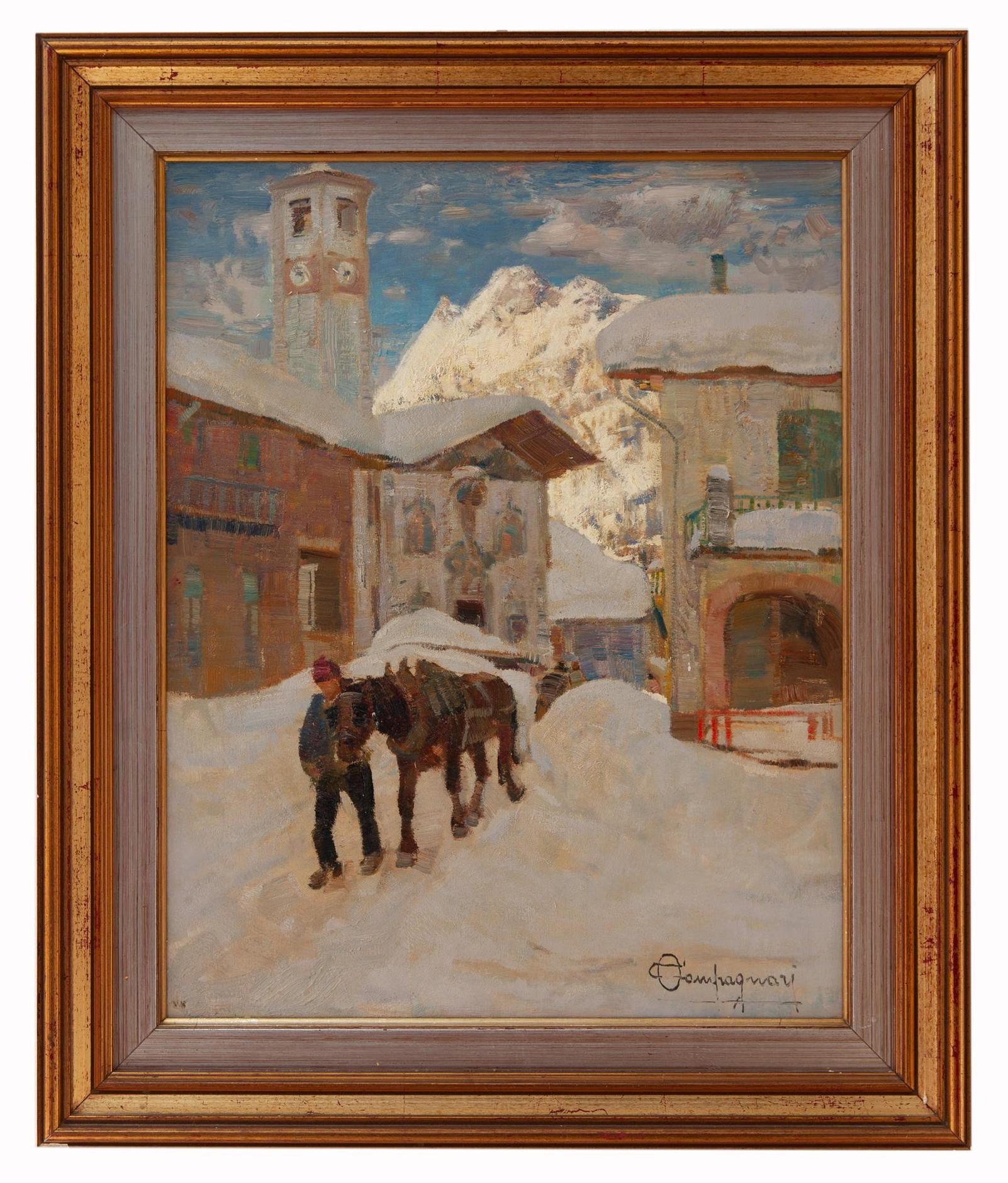 Ottorino Campagnari Mestre 1910 - Torino 1982 Castel Delfino, Val Varaita (CN) Olio su tavola cm 50x40 Ottorino Campagnari è stato un illustre artista paesaggista dello stile tardo ottocentesco, la cui carriera artistica ha inizio fin da giovane. Si specializzò nell'affresco di scene montane e nelle vibranti rappresentazioni delle mareggiate lungo la costa ligure, in particolare nelle vicinanze di Varigotti, dove spesso soggiornava per trarre ispirazione. La sua presenza artistica è stata notevole, partecipando a numerose mostre nazionali, tra cui spicca la sua partecipazione alla Promotrice di belle arti di Torino nel 1942. Campagnari ha tenuto sia mostre personali che ha partecipato a esposizioni collettive in Italia e all'estero. Le sue composizioni si caratterizzano per la loro piacevolezza e per la capacità espressiva dell'artista. Questa capacità espressiva è indubbiamente degna di interesse, paragonabile ai suoi paesaggi. È sostenuta da una solida e attenta preparazione artistica, che gli ha permesso in molti casi di catturare in modo straordinario la bellezza e l'autenticità di un paesaggio, spesso accompagnato da figure umane, e il mondo circostante. Questa impostazione artistica è rimasta costante nel tempo, mantenendo la sua struttura e la sua suggestiva adesione alle montagne che erano care ad altri grandi maestri dell'arte come Maggi, Musso, Rolla e Angelo Abrate. È evidente che Campagnari ha mantenuto intatto il suo dialogo con la natura, preservando la genuinità delle sue immagini, la fedeltà all'ambiente e la coerenza nella testimonianza di un dipingere che ha conquistato il pubblico per il suo costante amore per l'antica "veduta" e per il suo sincero intento rappresentativo. La sua raffigurazione è sempre piacevole, pronta a catturare il profondo significato di una tradizione paesaggistica che sembra resistere a ogni cambiamento estetico. Questa tradizione è indissolubilmente legata alla cultura figurativa piemontese dell'Ottocento e del Primo Novecento. Campagnari ha sviluppato una linea espressiva distintiva e inconfondibile, dimostrando una notevole abilità nel rendere con leggerezza e delicatezza il candido manto della neve e nel catturare gli ultimi dettagli di un paesaggio in continua trasformazione con il passare delle stagioni. La sua opera è un tributo duraturo alla bellezza della natura e alla ricca tradizione artistica dell'Ottocento e del primo Novecento, che continua a influenzare e a ispirare gli amanti di un genere pittorico che, pur in un mondo in continua evoluzione, resta un richiamo sentito e rassicurante nelle giornate agitate della nostra esistenza.