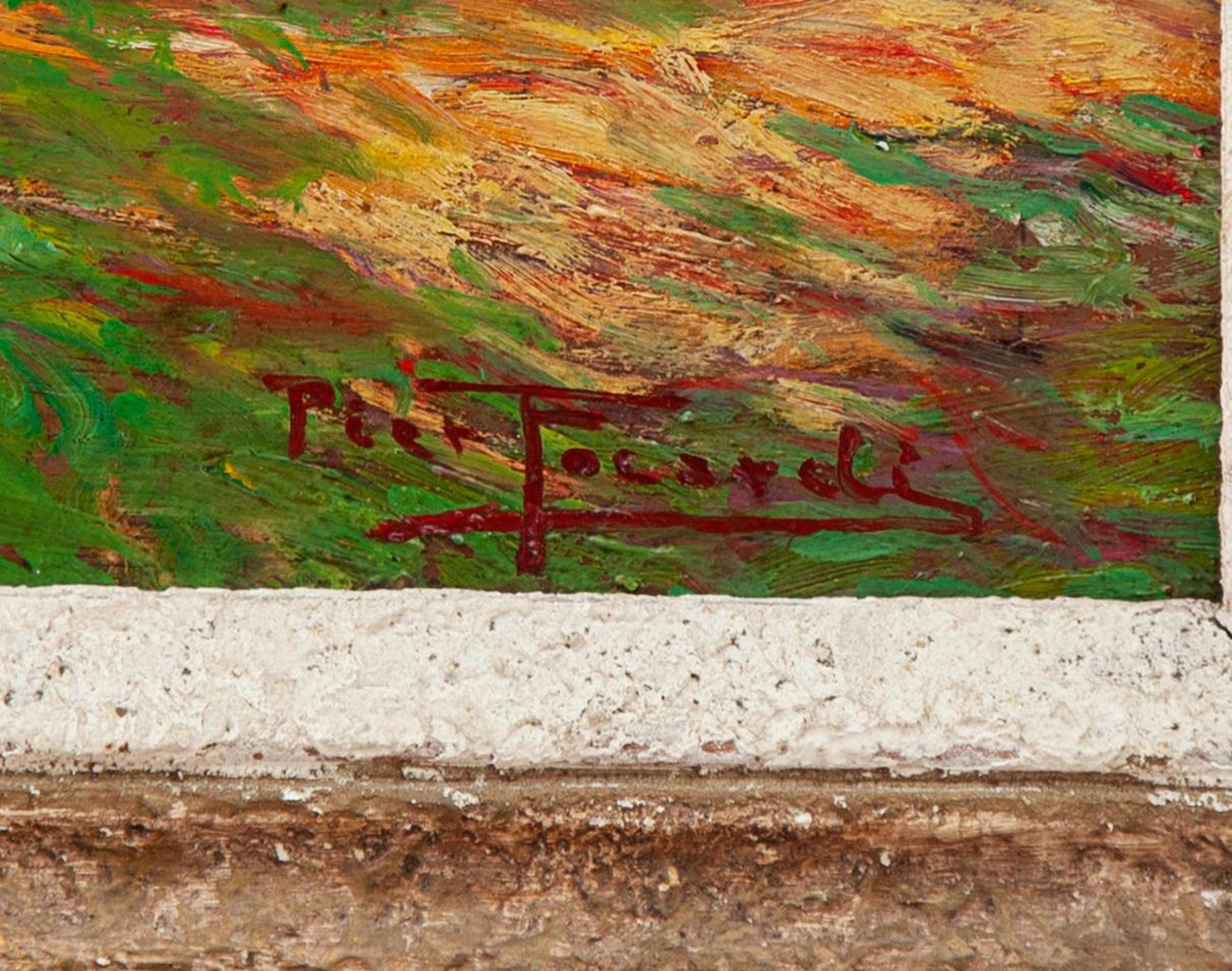 Piero Focardi Settignano (FI) 1889 - Cannes 1945 Baigneuse au soleil l'Autheir.1939 Olio su tavola cm 28x46 Piero Focardi, proveniente da una famiglia di artisti, inizia la sua carriera artistica all'età di quindici anni quando debutta alla Promotrice di Belle Arti di Firenze presentando due dipinti chiaramente influenzati dal naturalismo tardo macchiaiolo del padre Ruggero. Tuttavia, il suo percorso artistico lo porta ad avvicinarsi alla tecnica della scomposizione del colore, sviluppando uno stile del tutto autonomo. Questo cambiamento segna l'inizio della sua indipendenza artistica e lo porta a diventare uno dei principali esponenti dell'ultima generazione divisionista insieme ad artisti come Cesare Maggi, Leonardo Dudreville e Carlo Prada. Nel 1907, Piero Focardi espone nove delle sue opere al Salon des Peintres Divisionistes Italiens a Parigi, un evento organizzato da Alberto Grubicy, con cui aveva stabilito una collaborazione artistica. Questa esposizione gli conferisce un notevole successo e gli offre la possibilità di esporre anche ad Amsterdam nel 1911 e a Londra nel 1912, rafforzando ulteriormente la sua reputazione a livello internazionale. Pur essendo sempre stato profondamente dedicato alla pittura di paesaggio, Piero Focardi si specializza in particolare nelle vedute del Lago di Garda, creando opere che diventano molto apprezzate e esposte in importanti manifestazioni artistiche in Italia e all'estero. Nel 1937, Piero Focardi prende la decisione di trasferirsi definitivamente in Francia, concludendo così un capitolo significativo della sua carriera artistica e lasciando un'impronta duratura nel mondo dell'arte divisionista.