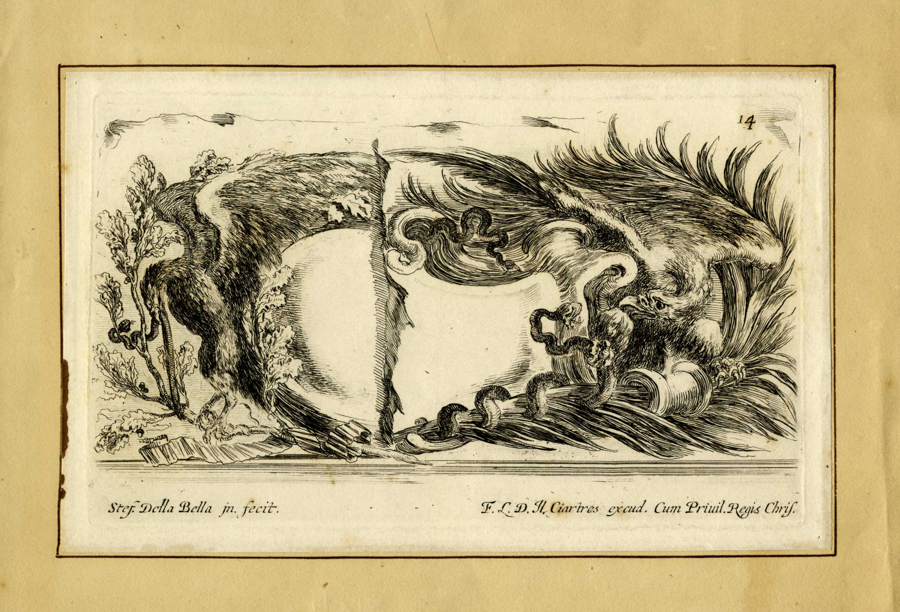 Stefano Della Bella, La Morte e la fanciulla. 1645-1661 ca. Acquaforte e bulino. mm 188x145. DeVesme/Massar, 90. In basso a destra "SDBella" a iniziali interlacciate. Da Le cinque morti, serie eseguita tra il 1645 e il 1661. Bellissima impressione nel III stato di 4, dopo i tratti a bulino ma prima dell'indirizzo di Vincent, stampata con segno pieno e nitido su carta vergellata lievemente spessa priva di filigrana. SI AGGIUNGONO: Id., Caccia al cinghiale. Acquaforte. mm 150x236. DeVesme/Massar, 733. Al margine in basso a destra a puntasecca "S.D.Bella". Da Cacce a diversi animali, serie in nove tavole databile al 1654. Ottima prova nell'unico stato impressa su carta vergellata con filigrana "tre mezzelune". / Id., Cartiglio con aquile e serpenti. Acquaforte. mm 115x195. Con montaggio: mm 180x258. DeVesme/Massar, 1040. Firmata in basso a sinistra. Dalla serie in diciotto tavole Raccolta di varii cappriccii et nove inventioni di cartelle... Buona prova nel II stato di 3 prima dell'indirizzo di Mariette su carta non vergellata. / François Collignon da Stefano Della Bella. Frontespizio da Serie di otto marine, serie eseguita nel 1634 e dedicata al principe Don Lorenzo di Toscana. Acquaforte. mm 123x217. DeVesme/Massar, 810. (4)