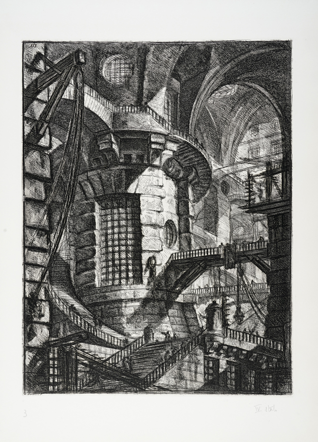Giovanni Battista Piranesi, La torre rotonda. 1749-1750 [VI edizione, tiratura moderna]. Acquaforte, bulino, puntasecca, morsura aperta, brunitoio. mm 545x417. Foglio: mm 700x495. Hind, 2. Robison, 30. Da Carceri d'invenzione, VI stato di 6 dalla VI e definitiva edizione, in tiratura moderna impressa su carta calcografica pesante Fedrigoni Fabriano. (9)