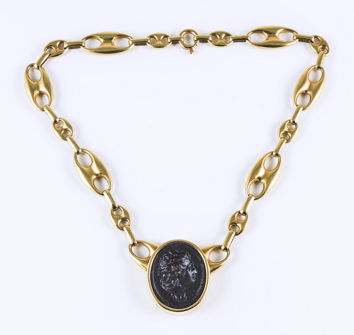 GIROCOLLO IN ORO GIALLO E CAMMEO - GOLD NECKLACE WITH CAMEO Anni Novanta - 90s al centro antico cammeo in pietra dura inciso con profilo maschile, catena a maglia marina gr 39,5