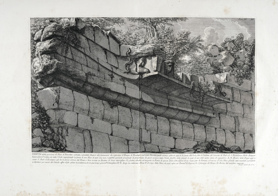 Giovanni Battista Piranesi, Le Antichità romane di Giambattista Piranesi Architetto Veneziano (Frontespizi Tomo secondo, Tomo terzo e Tomo quarto). 1756 [1784]. Acquaforte. mm 402/405x254/257. Foglio: mm 535/560x385/388. Ficacci, pp. 166-319, nn. 215, 278, 327. Tavole di frontespizio dai Tomi secondo, terzo e quarto de Le Antichità romane, opera in quattro tomi pubblicata per la prima volta da Bouchard e Gravier nel 1756 e in seconda edizione postuma nel 1784. Bellissime impressioni su carta vergellata pesante apparentemente priva di filigrana. SI AGGIUNGE: Id., VEDUTA della porzione di Nave di Travertini costruita, e piantata dinanzi alle sustruzioni che regevano il Tempio di Esculapio nell'Isola Tiberina. Acquaforte. mm Foglio: mm Ficacci, 341. Quindicesima tavola dal IV tomo de Le Antichità Romane. Bellissima prova su carta calcografica non vergellata. (4)