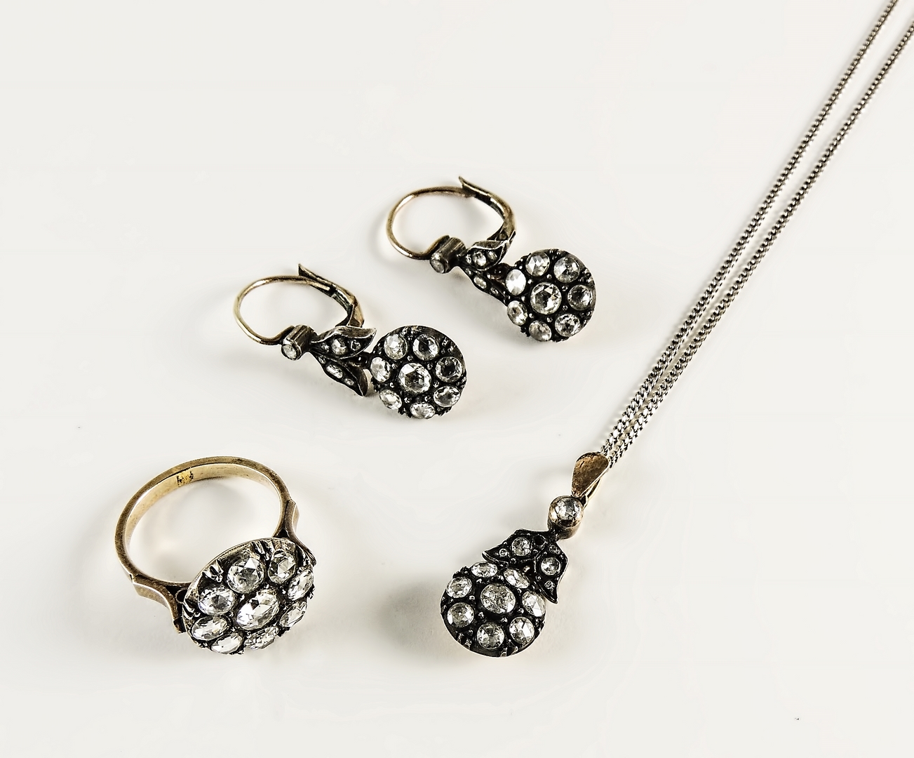 PARURE IN ORO A BASSO TITOLO E DIAMANTI - GOLD AND DIAMONDS PARURE inizio del XX secolo - early 20th Century composta da paio di orecchini pendenti, anello e charms con catenina, ciascuno realizzato come un fiore stilizzato impreziosito da rose di diamante briolette ct 2,60 circa, gr 17,68