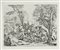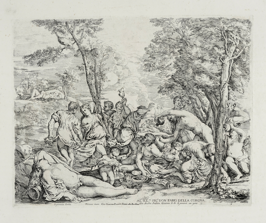 Giovanni Andrea Podestà, L'età dell'oro. 1640-1650. Acquaforte. mm 310x392. Foglio: mm 417x518. Bartsch, 7. TIB (Commentary).005 S2. In controparte dal Baccanale degli Andrii di Tiziano. Con la firma in basso al centro sotto la dedica a Don Fabio della Corgna. Bellissima prova, stampata con segno nitido e brillante, su carta lievemente spessa non vergellata con filigrana "P.M.". (1)