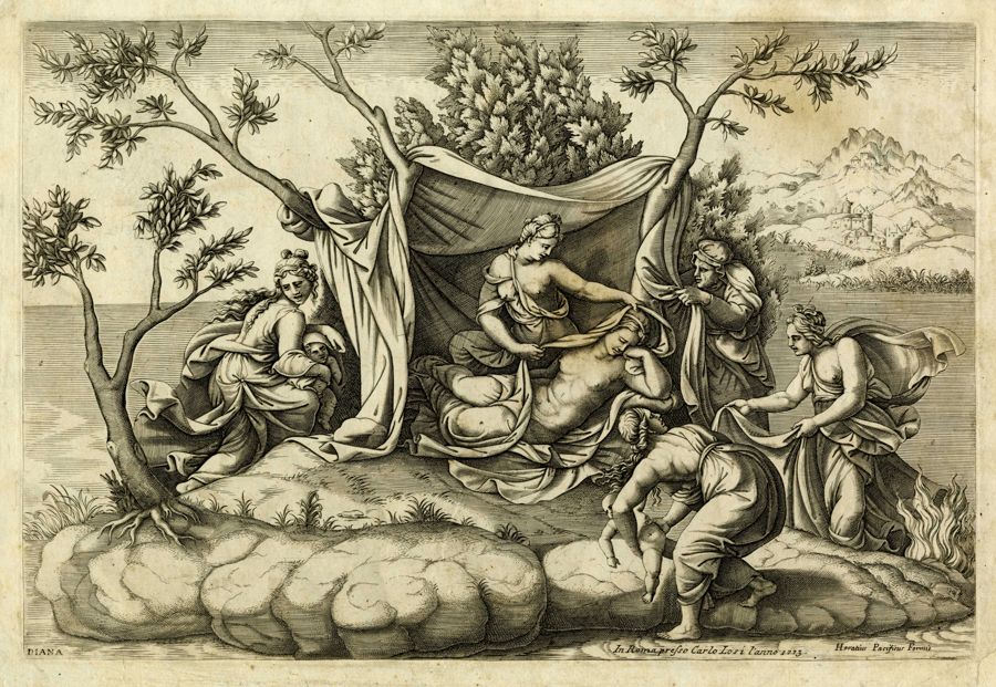 Diana Scultori, Latona partorisce Apollo e Diana nell'isola di Delo. 1575 / In Roma presso Carlo Losi l'anno 1773. Bulino. mm 258x384. Foglio: mm 280x407. Bartsch, 39. Bellini, 9. Massari (incisori mantovani del '500), 147. Da un disegno di Giulio Romano oggi al Louvre (inv. 3500) connesso con il dipinto di stesso soggetto ad Hampton Court. In basso a sinistra "DIANA" e a destra "In Roma presso Carlo Losi l'anno 1773.", con a seguire "Horatius Pacificus Formis". Ottima prova nel IV stato su 5, prima dell'abrasione di tutti gli indirizzi, su carta vergellata spessa priva di filigrana. (1)