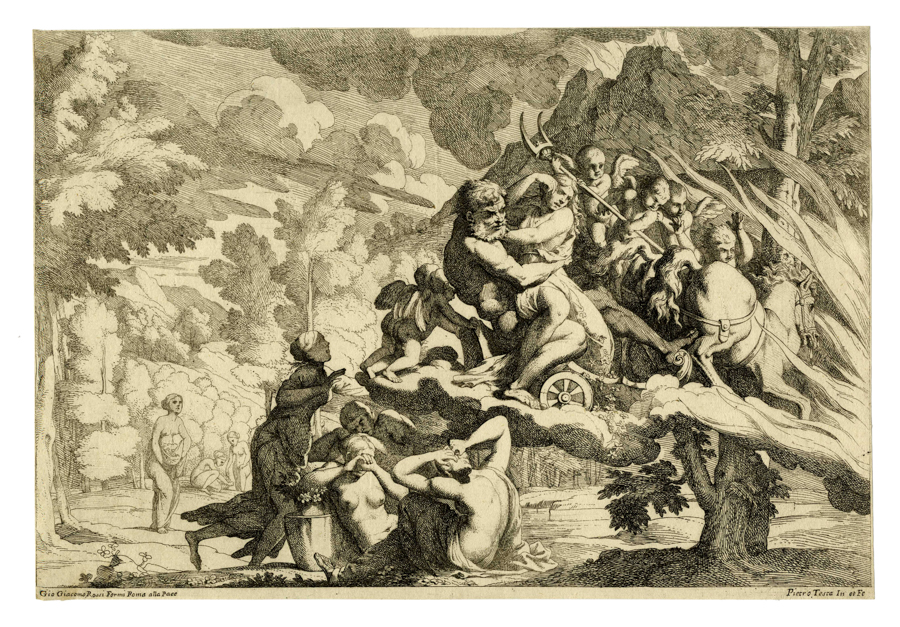 Giovanni Cesare Testa, Il ratto di Proserpina. 1650-1655 ca. Acquaforte. mm 241x350. Le Blanc, 7. Nagler, 9. Bellini (Testa), 54. Cropper, 123. Al margine inferiore a destra "Pietro Testa In et Fe" e a sinistra l'indirizzo di Giovan Giacomo De Rossi. La responsabilità autoriale a Pietro è apocrifa anche se a lui si deve certamente l'invenzione. Bella impressione nel II stato di 2 con l'indirizzo del De Rossi e la firma, su carta vergellata lievemente spessa con filigrana "fiore di giglio su tre monti in cerchio singolo sormontato da lettera M" (Woodward, 113. Orvieto s.d.). In alcuni esemplari di I stato al margine in basso a destra ancora parzialmente leggibile la scritta "P. Testa pinxit. J: Cesare T[esta] Fe". (1)