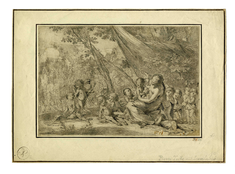 Pietro Testa, Giovane donna seduta, con amorini (Il giardino della Carità). 1631-1637 ca. Acquaforte. mm 173x253. Con il montaggio: mm 243x335. Bartsch, XX, 27. Bellini (Testa), 4. Cropper, 9. Sulla lastra in basso a sinistra "P. Mariette excud.". La prova è mancante dell'angolo in basso a destra dove era posizionato il monogramma. Buona prova nell'edizione pubblicata da Pierre Mariette I (Parigi, 1596-1657) dopo che era entrato in possesso della lastra, il rame non si trova per questo depositato presso l'Istituto Nazionale per la Grafica di Roma. La critica assegna questa acquaforte al periodo giovanile in virtù di alcune imperfezioni nella morsura e per il segno ancora incerto. (1)