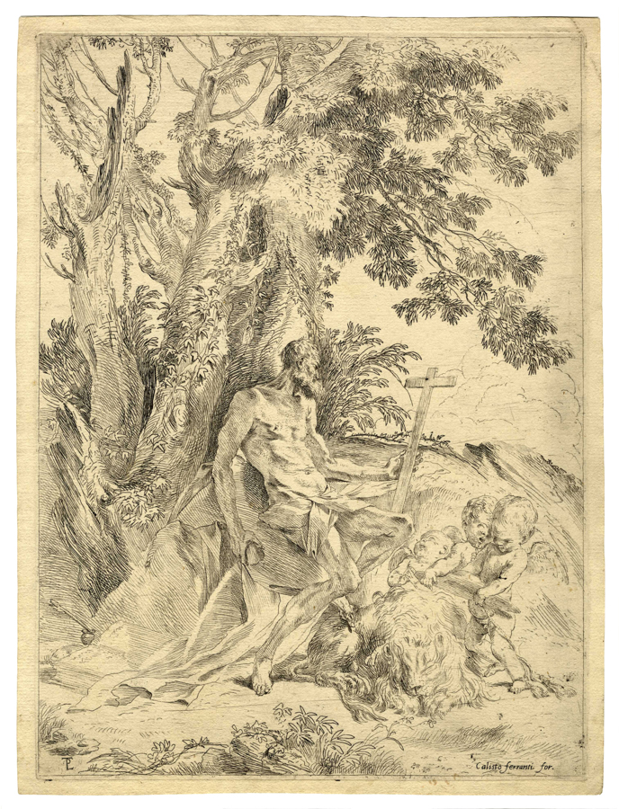 Pietro Testa, San Gerolamo. 1630-1631. Acquaforte. mm 308x230. Foglio: mm 322x245. Bartsch, XX, 15. Bellini (Testa), 9. Cropper, 8. Con il monogramma a lettere sovrapposte sulla lastra in basso a sinistra e l'indirizzo di Callisto Ferranti a destra. Ottima prova nel II stato di 3 prima della sostituzione dell'indirizzo del Ferranti con quello del De Rossi, su carta vergellata lievemente spessa con filigrana "corona a cinque punte su stella a sei punte" (Woodward, 264. Roma, 1580). In alto al verso la scritta "Pietro Testa" a penna e inchiostro bruno in antica grafia. (1)