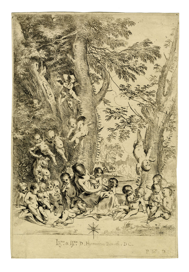 Pietro Testa, Giochi di putti (Il giardino della Carità). 1631-1632. Acquaforte. mm 396x270. Bartsch, XX, 28. Bellini (Testa), 11. Cropper, 11. Al margine inferiore a destra la firma dell'artista e al centro la dedica a Girolamo Buonvisi (1607-1677), il chierico lucchese che fu il più costante mecenate del Testa e al quale era probabilmente destinata la prima versione, in orizzontale, di questo soggetto. Al di sopra è lo stemma dei Buonvisi, una stella con il raggio inferiore allungato verso la punta di oro caricata al centro da una palla inquartata in croce di Sant'Andrea. Bellissima impressine nell'unico stato su carta vergellata lievemente spessa con filigrana non pienamente leggibile. (1)