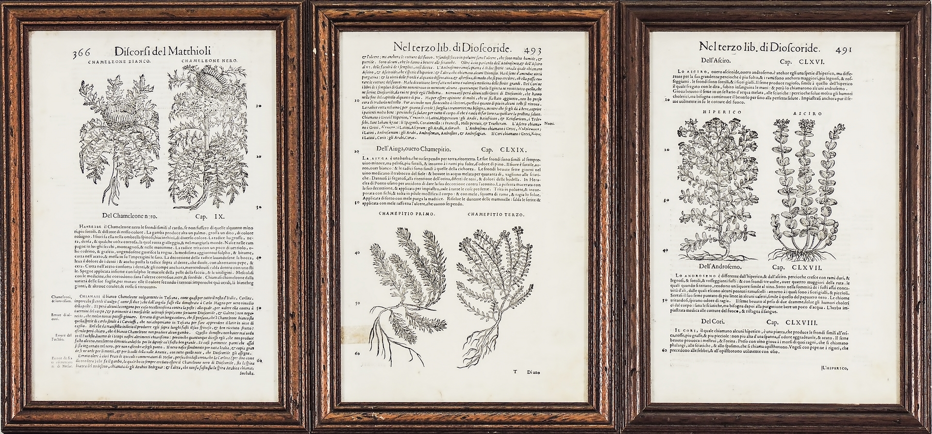 DA PETRUS ANDREA MATTIOLI - FROM PETRUS ANDREA MATTIOLISERIE DI TRE PAGINE DI erbario - Three Herbarium Plates, in cornice cm 31x20