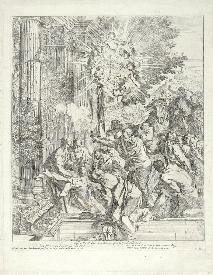 Pietro Testa, L'adorazione dei Magi. 1640 ca. Acquaforte. mm 428x355. Foglio: mm 528x414. Bartsch, XX, 3. Bellini (Testa), 16. Cropper, 63. Sulla lastra in basso verso sinistra "PTL. Pinx. et sculp." e al centro lo stemma Buonvisi con la stella a otto punte; al margine inferiore dedica a Gerolamo Buonvisi con quattro versi su due colonne, e all'estremità destra "Petrus Testa". Bella impressione nel III e definitivo stato con l'indirizzo di Giovan Giacomo De Rossi, su carta vergellata lievemente spessa con filigrana "fiore di giglio in cerchio singolo sormontato da lettera B". All'estremità sinistra del foglio a penna e inchiostro bruno nota di possesso con il numero "243" della collezione Santo Varni (Lugt, 3531). (1)