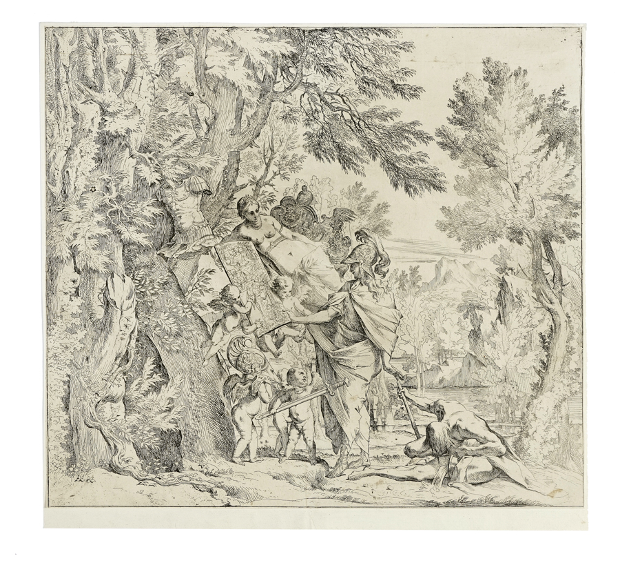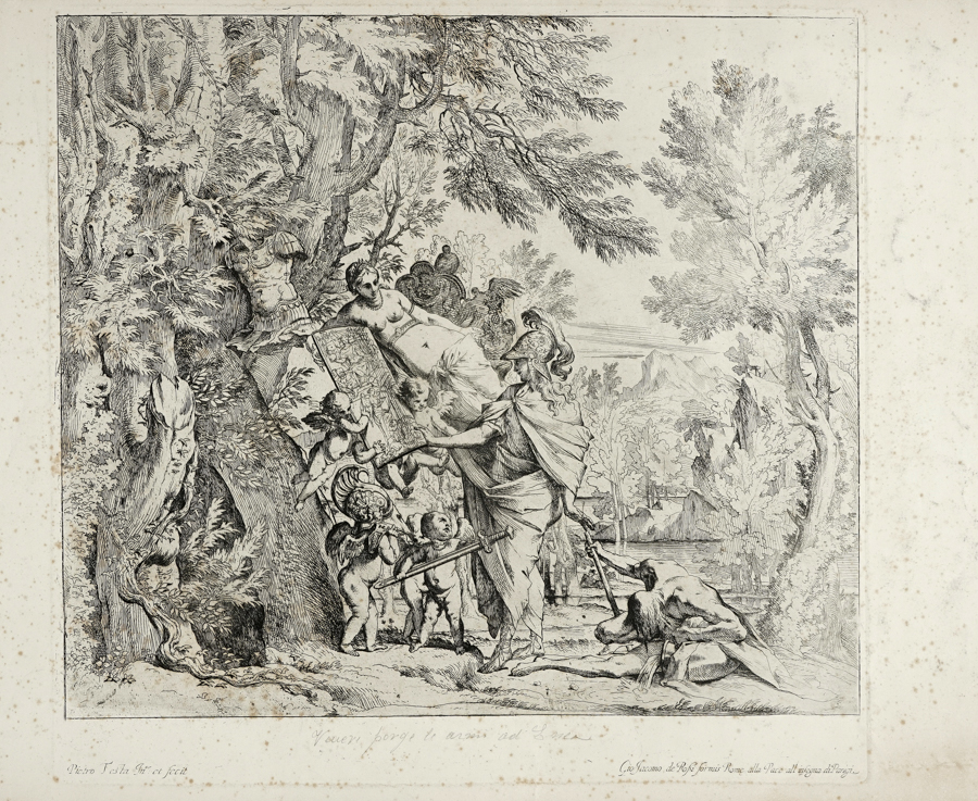 Pietro Testa, Venere consegna le armi a Enea. 1638-1640 ca. Acquaforte. mm 358x400. Bartsch,XX, 24. Bellini (Testa), 17. Cropper, 59. Ottima impressione priva delle responsabilità indicate al margine inferiore mancante, verosimilmente nel II stato di 2 (indicazione in antica grafia a penna e inchiostro bruno riportata sul supporto al verso) su carta vergellata lievemente spessa. In basso a destra al verso del supporto marchio di collezione non identificato a inchiostro nero con lettere "FT" interlacciate (Lugt, 1045b). SI AGGIUNGE: Id., Id. Acquaforte. mm 394x412. Foglio: mm 415x530. Altro esemplare nello stato definitivo in tiratura tarda su carta calcografica pesante. (2)