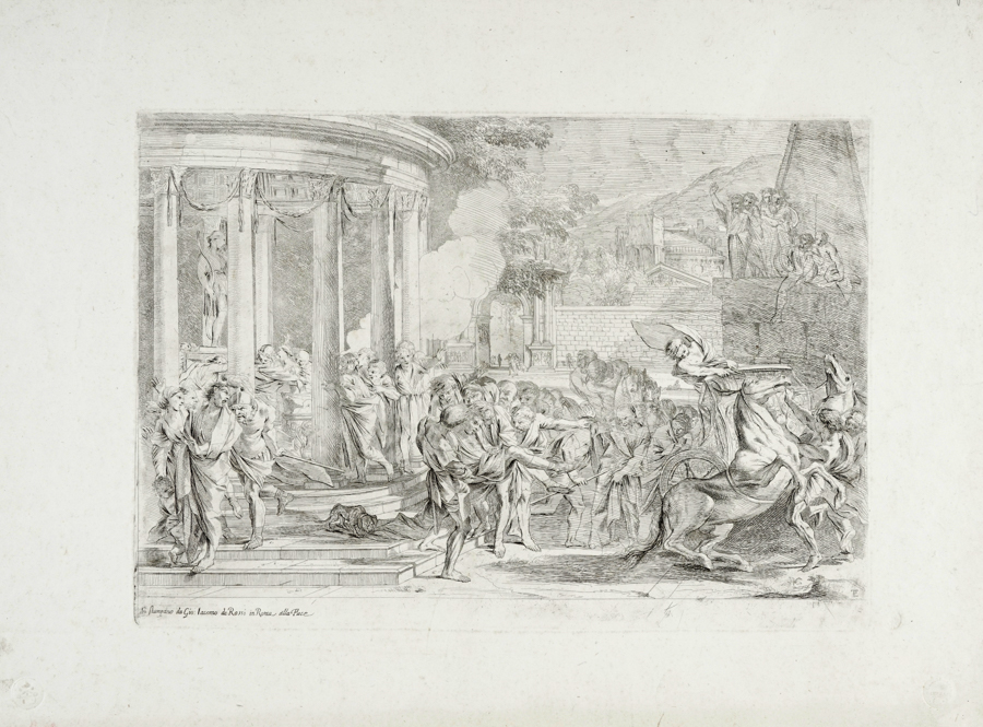 Pietro Testa, Sinorice trasportato dal tempio di Artemide. 1640 ca. Acquaforte. mm 287x410. Foglio: mm 355x445. Bartsch, XX, 19. Bellini (Testa), 19. Cropper, 53. Con il monogramma dell'artista sulla lastra in basso a destra. Bellissima e rara prova nel I stato di 2, avanti l'indirizzo di Giovan Giacomo De Rossi al margine inferiore a sinistra, stampata con tonalità su carta vergellata sottile con filigrana. "figura inginocchiata con croce entro scudo stretto", (Woodward, 25. Macerata, 1618). Al verso in alto al centro il numero "29" a penna e inchiostro bruno in antica grafia. L'episodio è tratto dal De mulierum virtutibus di Plutarco e narra dell'avvelenamento del tetrarca Sinorice da parte di Camma, moglie del tetrarca Sinato fatto uccidere da Sinorice. SI AGGIUNGE: Id., Id., Acquaforte. mm 287x412. Foglio: mm 438x580. Bella prov nel II e definitivo stato con l'indirizzo di De Rossi su carta calcografica non vergellata, edizione Calcografia camerale con marchi a secco al margine inferiore. (2)