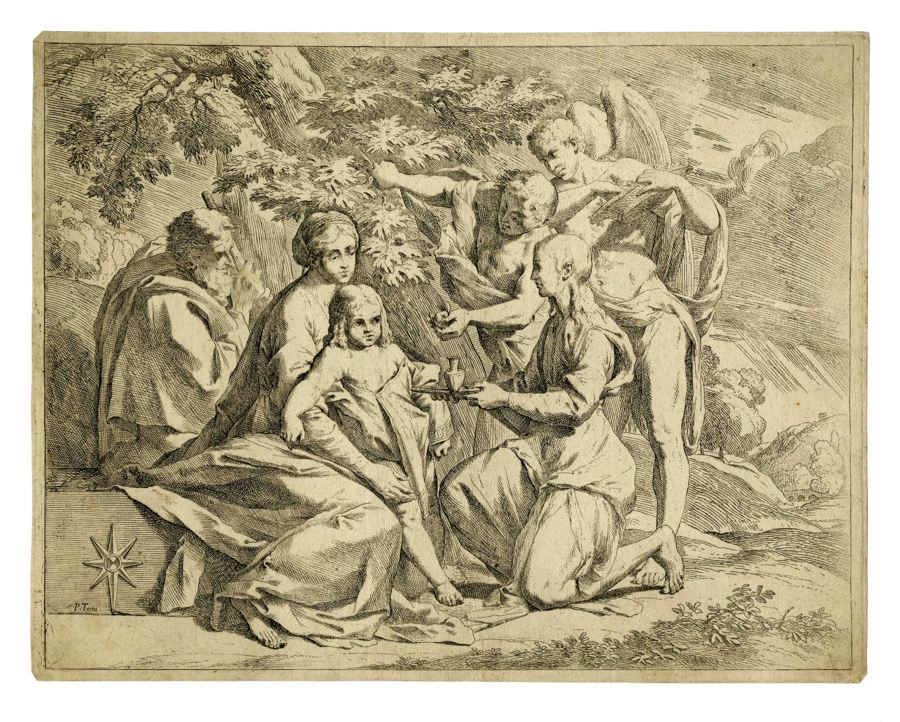 Pietro Testa, La Sacra Famiglia nutrita dagli angeli. 1642-1644. Acquaforte e puntasecca (?). mm 232x305. Foglio: mm 245x312. Bartsch, XX, 12. Bellini (Testa), 27. Cropper, 94. Firmata sulla lastra in basso a sinistra accanto allo stemma stellato Sottildei Buonvisi. Ottima impressione nel I stato di 2 avanti l'indirizzo di Giovan Giacomo de Rossi in basso a sinistra. Carta vergellata con filigrana "fiore di giglio in cerchio singolo sormontato da corona a cinque punte" (Woodward, 104. Roma s.d.). Al verso marchio di collezione a inchiostro nero apparentemente non su Lugt. (1)