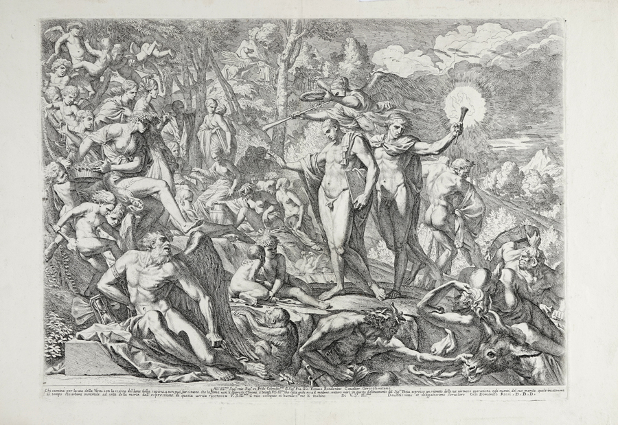 Pietro Testa, Il trionfo dell'artista virtuoso al Parnaso. 1644-1646 ca. Acquaforte e puntasecca. mm 418x570. Foglio: mm 485x735. Bartsch, XX, 33. Bellini (Testa), 33. Cropper, 102. Al margine inferiore estesa dedica di Giovan Domenico De Rossi indirizzata a Giovanni Tommaso Rondanino, cavaliere di Gerusalemme, con all'interno la responsabilità dell'esecuzione a Pietro Testa. Il tema celebra l'arrivo dell'artista-saggio sul Parnaso e rappresenta la meditazione finale di Testa sul tema del proprio trionfo sull'ignoranza e sul vizio. L'artista eroe è guidato nella sua difficile ascesa dalla Divina Saggezza, che, secondo l'iscrizione presente nel primo stato, lo allontana e lo protegge dai mostri malvagi raffigurati nel registro inferiore. La tavola può considerarsi idealmente pendant di Altro diletto... ed episodio conclusivo del pellegrinaggio allegorico di Testa lungo il difficile percorso verso la Virtù. Bellissima prova nel II stato su 3 dopo la sostituzione della dedica a Jean Minard, impressa su carta vergellata spessa con filigrana "fiore di giglio in cerchio singolo sormontato da lettera N" (Roma, 1671 ca.). (1)