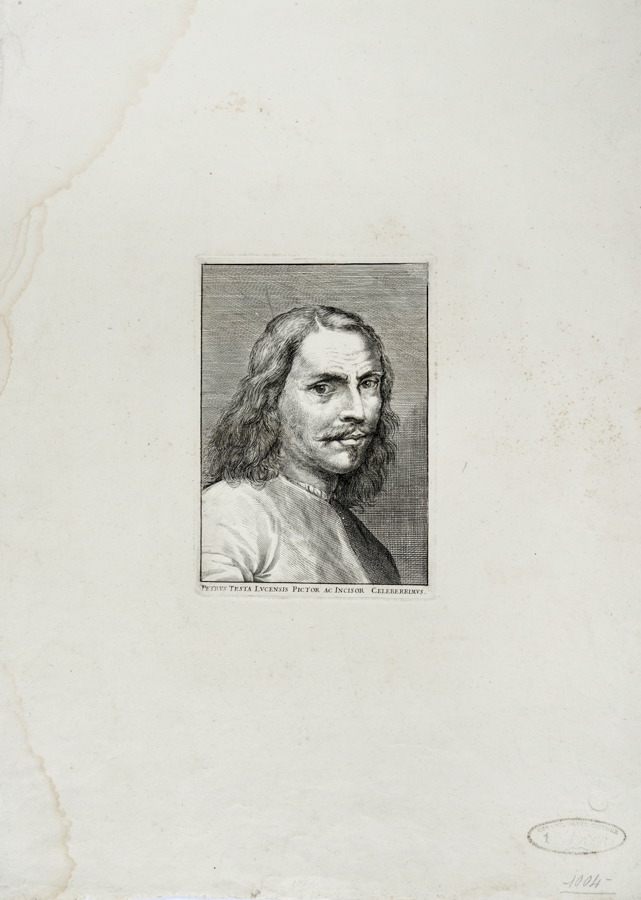 Pietro Testa, Ritratto di Pietro Testa Pictore eccel.te. 1645 ca. Acquaforte e puntasecca. mm 224x166. Foglio: mm 232x173. Bartsch, XX, 1. Bellini (Testa), 35. Cropper, 106. Bella impressione nel II stato di 3 secondo Bellini con l'indirizzo di Collignon, su carta vergellata sottile con filigrana "colomba su tre monti in cerchio sin golo sormontato da lettera G" (Italia, 1663-1667). SI AGGIUNGE: Anonimo XVII secolo. Petrus Testa Lucensis Pictor ac Incisor Celeberrimus. !650-1680. Bulino. mm 212x148.F oglio: mm 570x440. Al margine in basso a destra marchio a secco non identificato con iniziali "R.I" entro cerchio (non su Lugt) e timbro a inchiostro nero "SOPRAINTENDENZA CAMERALE 1a Prova" (Lugt, 5783). (2)