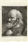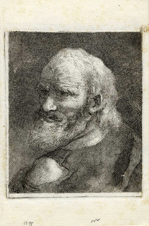 Giandomenico Tiepolo, Vecchio barbuto. 1775-1800. Acquaforte. mm 135x113. Foglio: mm 188x125. De Vesme, 175. Rizzi (1970), 215. Rizzi, 219. Da Raccolta di teste, serie di trenta incisioni da soggetti di Giovan Battista Tiepolo. Il progetto di realizzare una serie di teste di "carattere" trae spunto dalle Teste all'orientale del Grechetto; Giandomenico iniziò a lavorare ad un primo nucleo di ventisette incisioni tra il 1757 e il 1762, successivamente, dopo la morte del padre al rientro dalla Spagna (1770), riprese il tema e ampliò la sua raccolta che complessivamente risultò di sessanta acqueforti. La serie, dopo la comparsa del numero in ciascuna lastra, ebbe una prima edizione nel 1769-1774 e una seconda edizione nel 1775. Buona prova in edizione tarda nel II e definitivo stato dopo la comparsa del numero "28" sulla lastra in basso a sinistra. Carta vergellata spessa priva di filigrana. (1)