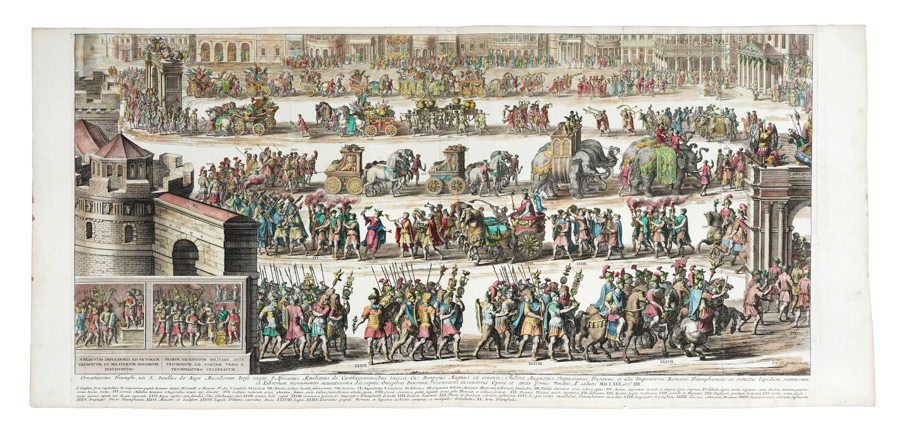 Jan van den Aveelen, Ornatissimi Triumphi, uti L: Paullus de Rege Macedonum Perse capto...ex vetustis lapidum, nummorum et Librorum monumentis accuratissima discriptio, Onuphrii Panvinii Veronensis inventoris Opera et aeneis formis Venetiis Ao. salutis MD. LXXX Greo: XIII. Stoccolma, 1698 ca. Acquaforte e bulino in coloritura. mm 384x760. Foglio: mm 390x810. Firmata sulla lastra in basso a destra "I.V. den Aveelen f. et del.". Grande stampa decorativa a fregio ispirata alle tavole di corredo al Comentario dell'vso, et ordine de' trionfi antichi. Di fra Onofrio Panuinio dell'Ordine heremitano, In Venetia: appresso Michele Tramezzino, 1571. (1)