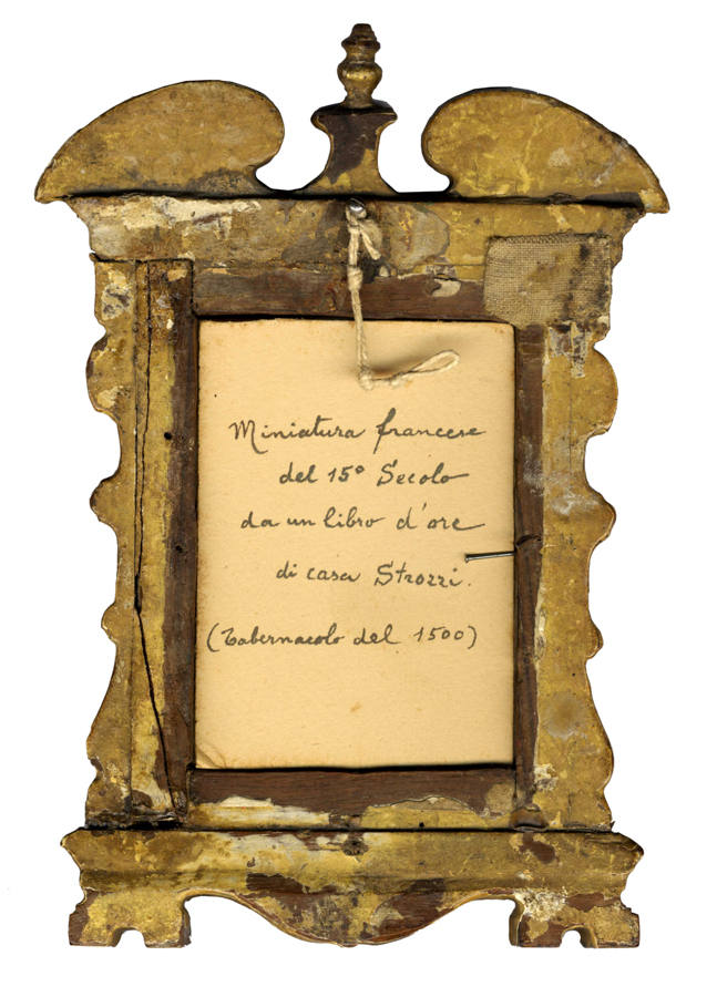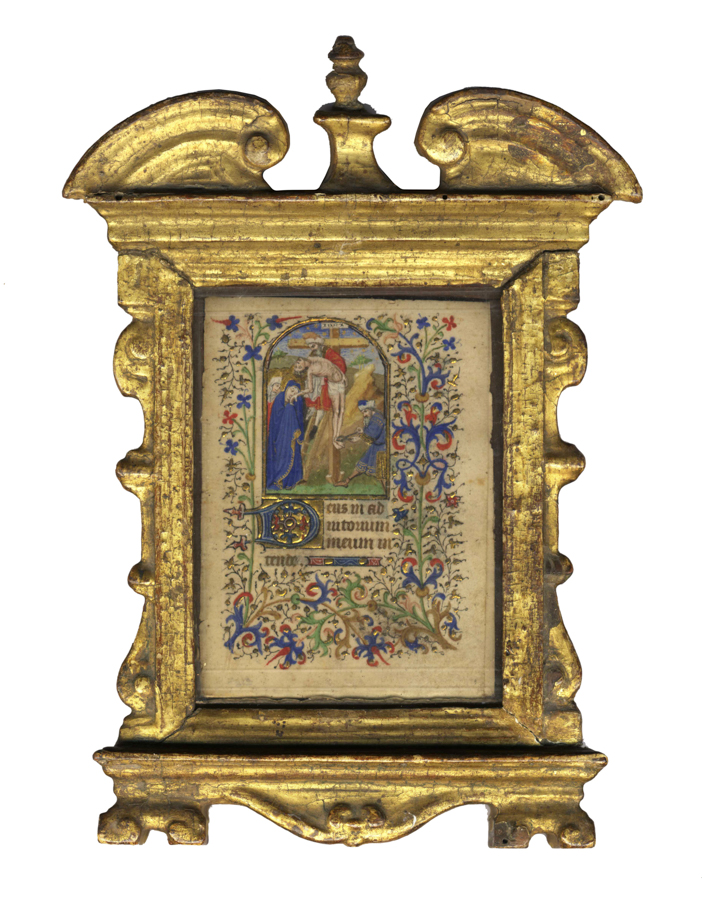 Scuola francese del XV secolo, Discesa dalla croce. Francia settentrionale, 1470 ca. Tempera a colori e oro su pergamena. mm 108x79. Miniatura raffigurante la discesa dalla croce secondo l'episodio, narrato nei vangeli, con Giuseppe di Arimatea e Nicodemo intenti a scendere il corpo di Cristo (Giovanni 19,38-42) e la Vergine e la Maddalena a lato della croce. L'immagine è circondata da un bordo foliato con fiori rossi, blu e rosa con steli verdi; oltre foglie d'acanto blu e oro. Un'iniziale miniata su tripla riga (la lettera "D") in oro brunito e blu con dettagli in rosso. Il testo "Deus in adiutorium meum intende", in caratteri gotici latini marrone dorato, è tratto dal primo verso del Salmo 70 (Salmo 69 nella Vulgata) e costituisce la preghiera introduttiva a tutte le Ore dei Breviari romani, ambrosiani e monastici. Al verso testo dal Salmo XXIII (versi 7-9) in gotico latino su 13 righe con iniziali miniate in oro brunito ("D,G,S,A,Q") e testo in marrone dorato: "Domine, ad adiuvandum me festina / Gloria pri [Patri]/Sicut erat [in principio, et nunc et semper] / Attollite portas, principes, vestras, et elevamini portae aeternales et introibit Rex gloriae / Quis est iste Rex gloriae Dns [Dominus] virtutum ipse est Rex gloriae." (1)