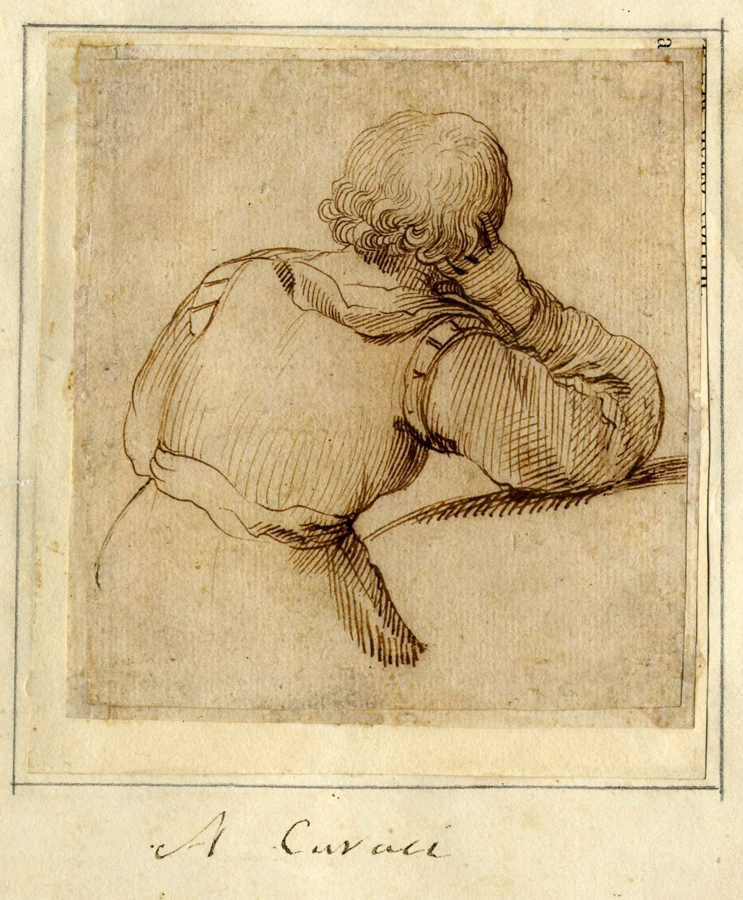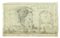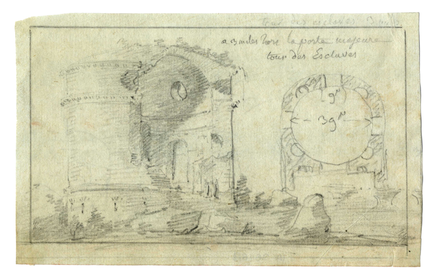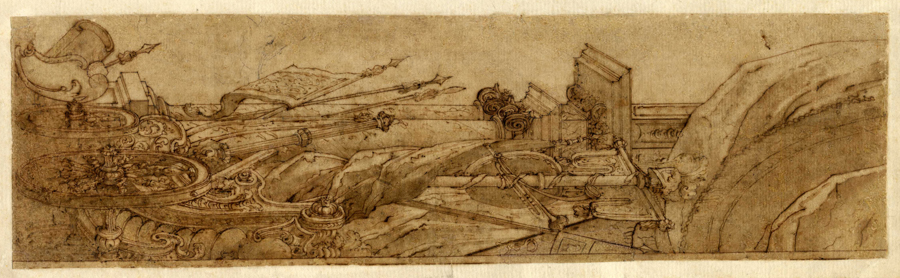 Anonimo del XVII secolo, Panoplia. Penna e inchiostro bruno su carta vergellata color nocciola. mm 373x105. Foglio applicato a pieno a supporto in carta vergellata pesante. Con il supporto: mm 403x120. SI AGGIUNGE: Scuola francese XVIII secolo. Tour des esclaves. Matita di grafite su carta vergellata sottile bianca. In alto a destra iscrizione a matita "tour des Esclaves". mm 94x150. Il piccolo foglio raffigura il mausoleo e la pianta dell'aula ottagonale che si trova lungo Via Prenestina presso la Villa Gordiani: il nome è dovuto probabilmente al fatto che tale rudere a fine Cinquecento appartenne a Vincenzo Rossi dello Schiavo. (2)