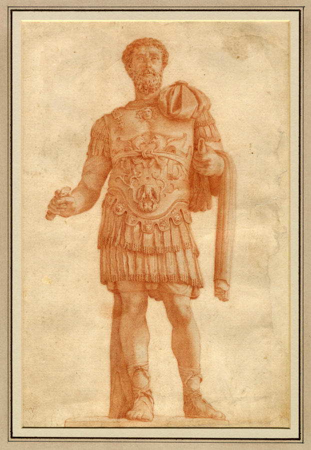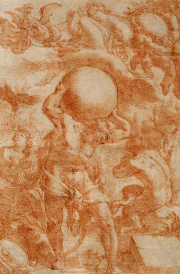 Anonimo della seconda metà del XVII secolo, Atlante. Matita rossa su carta vergellata spessa priva di filigrana. mm 308x212. Affollata composizione con il titano Atlante al centro intento a sorreggere la volta del cielo, in alto figura femminile su un carro trainato da draghi (Medea?), all'angolo destro in alto putti sorreggono uno stemma coronato vuoto, altro stemma in basso a sinistra. Ai lati di Atlante un cantore nell'atto di suonare la lira (Orfeo) e un satiro visto da tergo affiancato da un cervo. SI AGGIUNGE: Anonimo del XVIII secolo. Marco Aurelio. Matita rossa su carta vergellata color crema con filigrana "fiore di giglio in cerchio singolo sormontato da lettera V". (2)