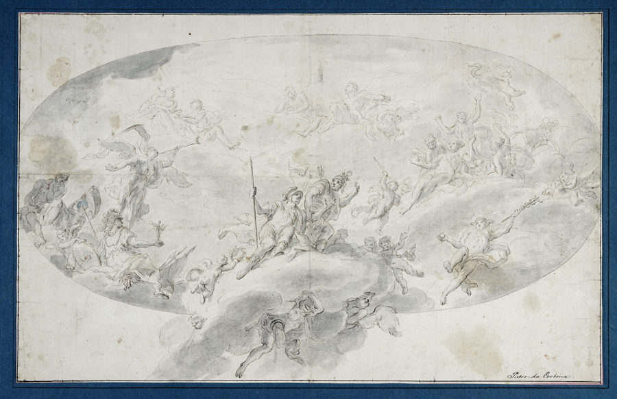 Anonimo della seconda metà del XVII secolo, Convito degli dei. Penna e inchiostro bruno, pennello e acquerello grigio, minimi rialzi in bianco. Carta vergellata color crema. Tratto di inquadramento a penna e inchiostro bruno. In basso a destra a penna e inchiostro bruno "Pietro da Cortona". mm 368x490. Applicato al lato superiore a montaggio in cartone blu con in basso a sinistra scritta a penna e inchiostro bruno "Pietro da Cortona fec. Cabinet de Spengler no. 58". Johan Conrad Spengler (Copenhagen, 1767-1839) fu consigliere di stato e cavaliere dell'ordine di Dannebrog. oltreché direttore delle gallerie reali danesi. Nella composizione in basso a sinistra ancora marchio a secco del collezionista danese Benjamin Wolff (Engelholm, Naestvad, 1790–1866) (Lugt, 420). Al verso sul supporto cinque righe di notizie su Pietro da Cortona a penna e inchiostro bruno in antica grafia. (1)