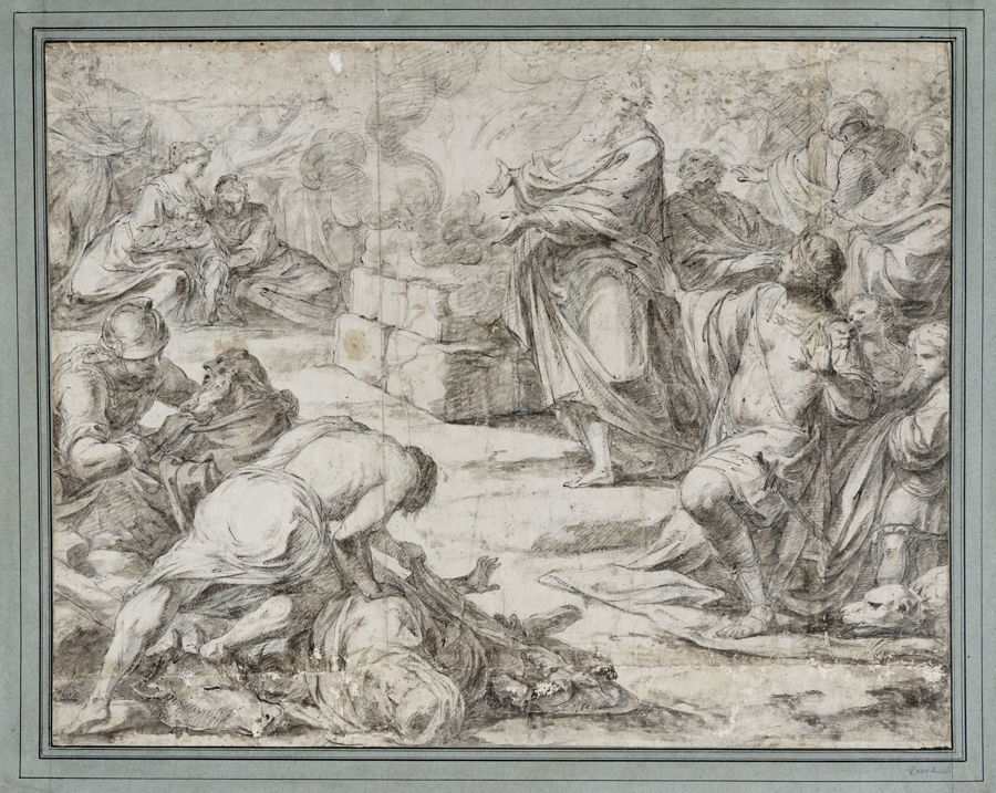 Anonimo del XVIII secolo, Il sacrificio di Elia e l'uccisione dei sacerdoti di Baal. Matita nera, penna e inchiostro bruno, acquerello grigio, carat vergellata pesante color beige. mm 455x580. Applicato a pieno su supporto in cartoncino pesante ed entro vecchio passepartout grigio-verde decorato con filetti a inchiostro nero. Con il montaggio mm 555x695. La scena sembra ispirata all'episodio del Libro dei Re (18,20-40) che vede il profeta Elia opporsi al re di Samaria, Acab, colpevole, istigato dalla moglie Gezabele, di aver servito l'idolo Baal, e per essersi prostrato dinanzi a lui, con la sfida finale sul monte Carmelo tra Elia e i sacerdoti di Baal. (1)