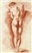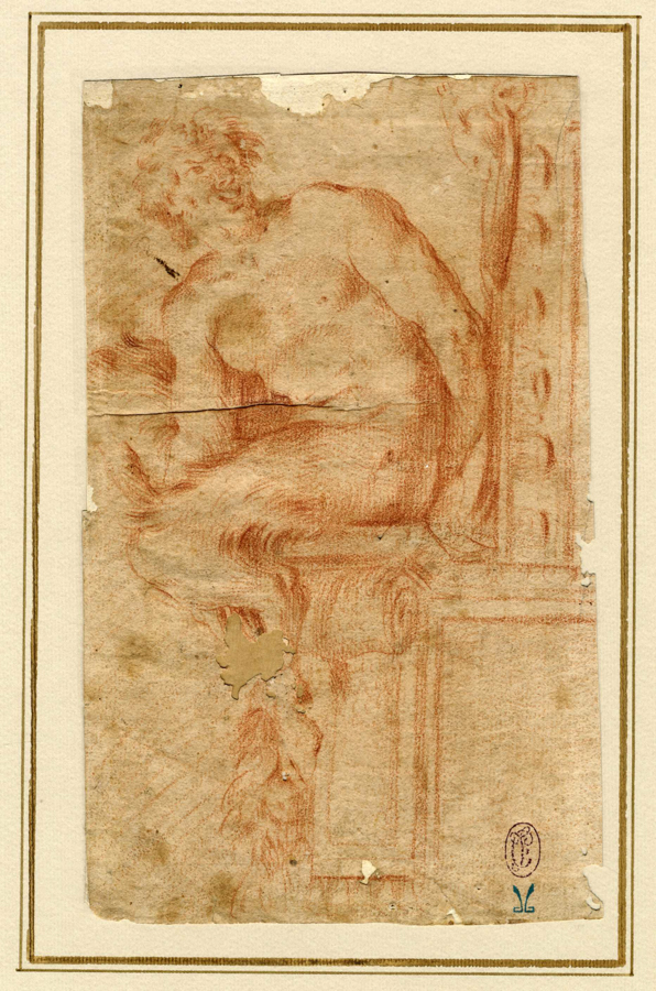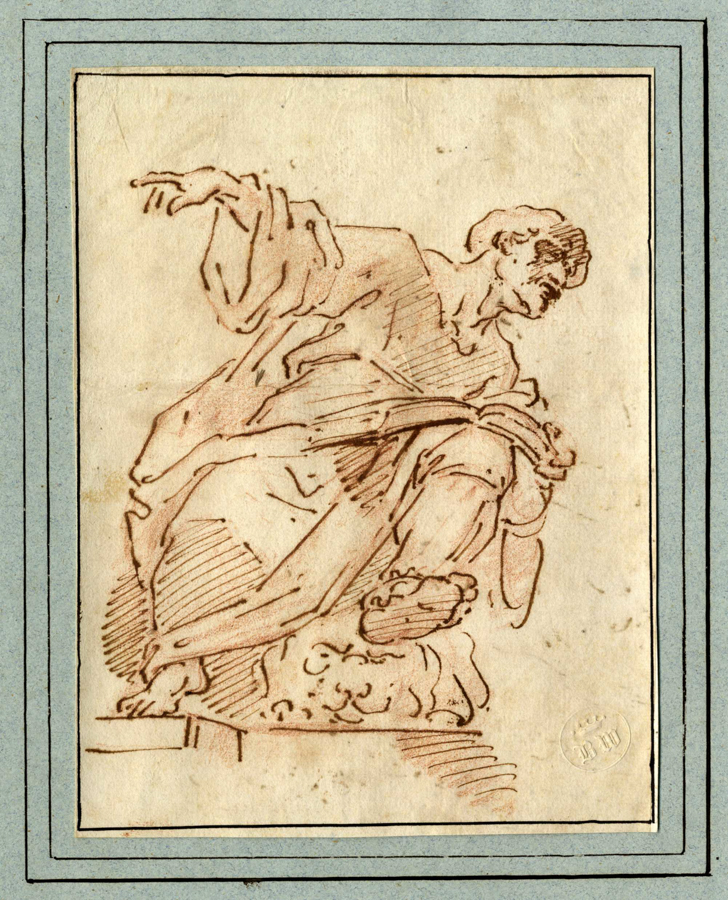 Anonimo del XVIII secolo, Studio per San Marco evangelista. Penna e inchiostro bruno, matita rossa, carta vergellata color crema. In basso a destra marchio a secco del collezionista danese Benjamin Wolff (Engelholm, Naestvad,1790–1866) (Lugt, 420). mm 180x135. Applicato in alto su vecchio supporto in cartoncino azzurro con filetti a penna e inchiostro bruno. Con il montaggio: mm 270x230. SI AGGIUNGONO: Anonimo del XVII secolo. Satiro seduto. Matita rossa su carta vergellata sottile. mm 203x125. Da Annibale Carracci. In basso a destra al recto marchio di collezione Cesare Frigerio (Lugt, 4363) e marchio di collezione Giorgio Dalla Bella (Lugt, 3774). / Anonimo del XVIII secolo. Nudo maschile visto da tergo. Matita rossa su carta vergellata avorio con filigrana "Sette province". mm 303x183. (3)
