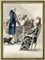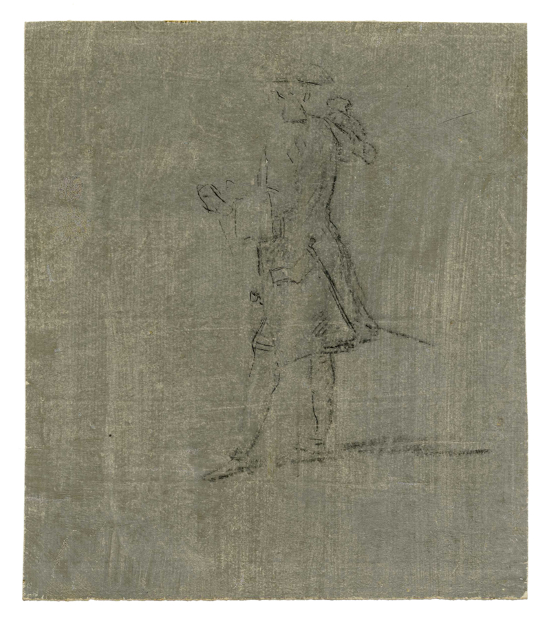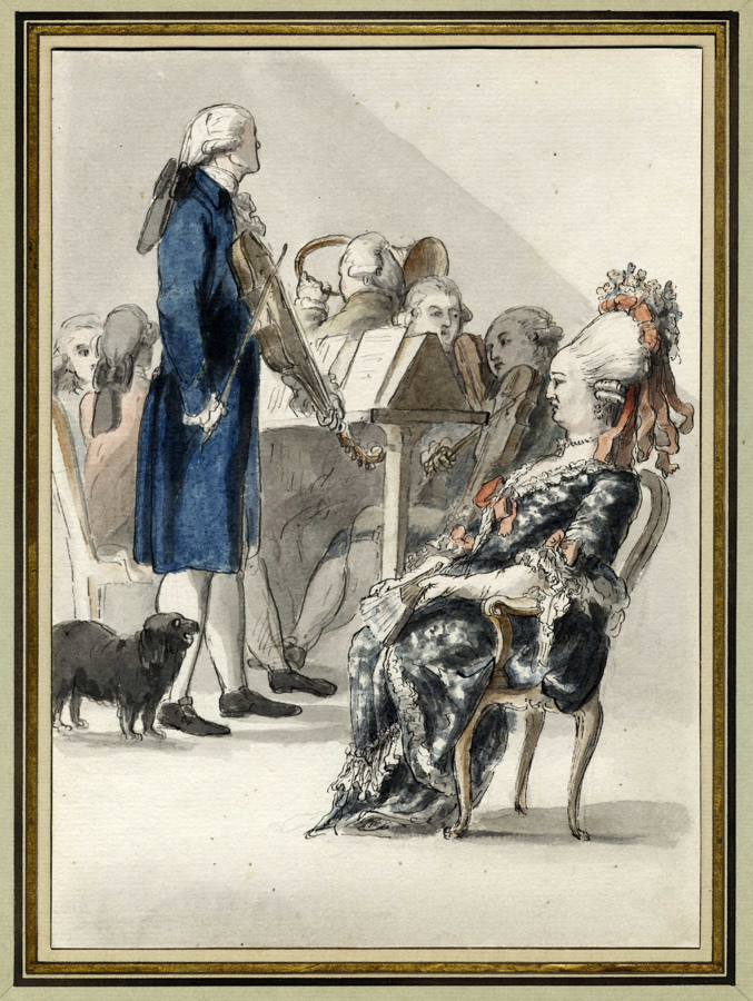 Anonimo della fine del XVIII secolo, Concertino. 1790 ca. Penna e inchiostro bruno, minime tracce di matita di grafite, pennello e acquerello a colori, carta vergellata bianca. mm 250x182. Scena di costume di buona qualità pervenuta come di scuola veneta del XVIII secolo, forse considerando la figura della dama anziana seduta sul primo piano, in particolare la sua elaborata e fantasiosa acconciatura, da ipotizzare di ambito inglese con sentore delle caricature della società di Fussli. SI AGGIUNGE: Id., Figura di profilo in redingote e spadino. Matita nera su carta vergellata bianca preparata in grigio. mm 190x170. (2)