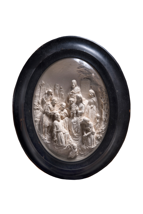 Anonimo del XIX secolo, Adorazione dei Magi. Ovale in gesso a basso e altorilievo. mm 300x225. Opera accademica che si ispira alla grande tradizione scultorea, replica di altra di identico soggetto e di identiche dimensioni conservata presso il Museo della Basilica di San Domenico a Bologna (catalogo generale dei Beni culturali codice n. 0800025077). Nella versione conservata a Bologna si legge in basso sull'ovale un'iscrizione che nella scheda della Soprintendenza è stata letta come "Dossenel"; altrimenti nelle intenzioni del vecchio catalogatore da riferire forse ad Alceo Dossena (Cremona, 1878 – Roma, 1937).