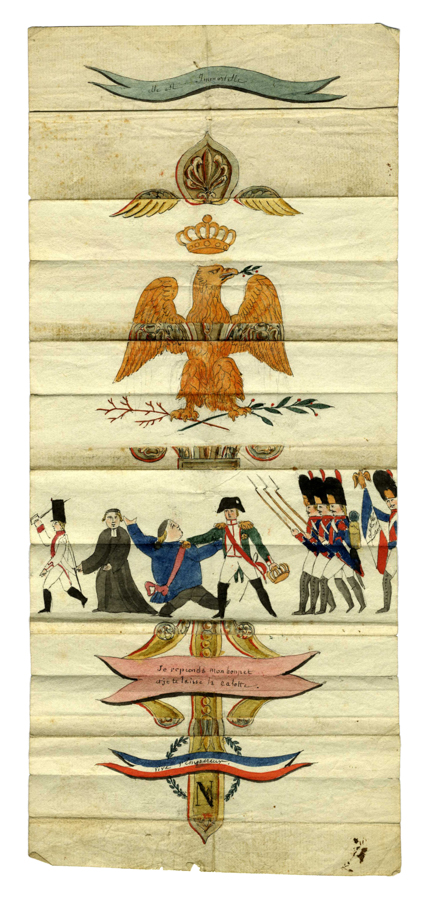 Anonimo della prima metà del XVIII secolo, Je reprends mon bonnet et je te laisse ta calotte. 1815 ca. Penna e inchiostro bruno, matita di grafite, acquerello a colori. Formato chiuso: mm 104x112. Formato aperto: mm 253x112. Piccolo disegno satirico piegato a fisarmonica che in formato chiuso presenta le insegne napoleoniche con il giglio, la lettera "N" e in alto la scritta "elle est immortelle", nel nastro poi con i colori di Francia "vive l'empereur". Una volta aperto al centro si osserva una vignetta con Napoleone nell'atto di strappare la corona a Luigi XVIII che indossa lo zucchetto sacerdotale e la scritta "Je reprends mon bonnet et je te laisse ta calotte (Mi riprendo il berretto e ti lascio lo zucchetto)". Da confrontare con un'acquaforte di incisore anonimo di medesimo soggetto appartenente a una serie intitolata Retour de l'île d'Elbe e conservata al Musée Carnavalet, Histoire de Paris (inv. G27437). Soggetto nato durante i "Cent-Jours" il periodo tra il ritorno di Napoleone Bonaparte a Parigi (20 marzo 1815) dall'esilio all'isola d'Elba e la restaurazione dei Borbone con re Luigi XVIII (8 luglio dello stesso anno). (1)