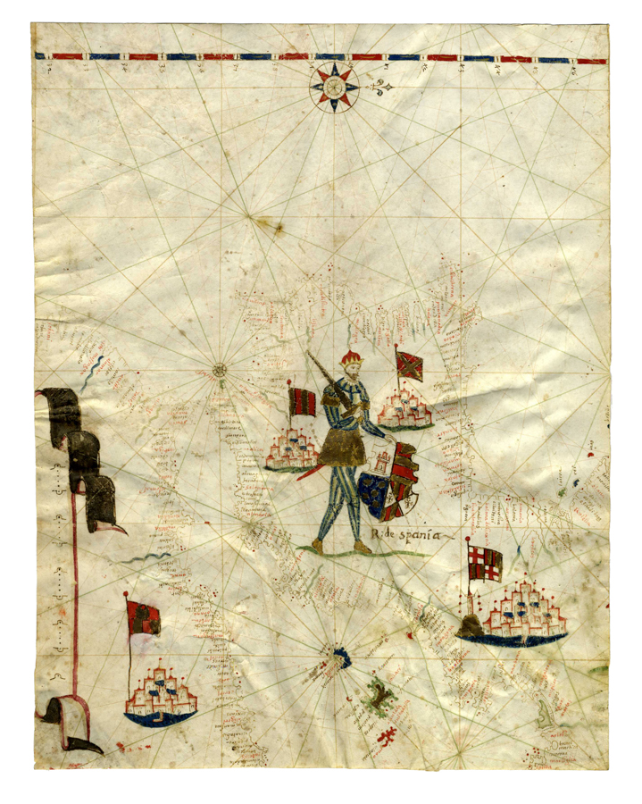 Anonimo del XVI secolo, Mappa nautica delle coste della Spagna. Tempera a colori con rialzi in oro su pergamena. mm 278x220. Due rose dei venti e quattro rappresentazioni di città: alla sinistra della figura reale che campeggia al centro, Valencia e il suo stemma (con quattro pali di rosso in campo oro), alla sua destra, città con vessillo croce di Borgogna, nella parte bassa a destra la città di Barcellona con il suo stemma (combinazione delle due distinte armi: quello proprio della città di Barcelona, "d'argento alla croce rossa" o "croce di San Giorgio" il patrono della città, con quello della casa reale di Aragona, "d'oro a quattro pali di rosso"). Nella zona circostante linee frastagliate dense di toponimi. (1)