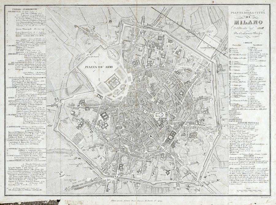 Antonio Bossi, Pianta della città di Milano. Milano: presso Antonio Bossi, 1866. Incisione in rame. mm 365x490. Foglio: mm 393x534. Al margine in basso a destra "Demczyńsli inc.". A destra e a sinistra sono posizionate legende con le indicazioni dei luoghi più significativi, i "primari stabilimenti" (palazzi, archivi, direzioni, uffici, delegazioni, caserme, licei, collegi, teatri, anfiteatri, ospedali), le chiese, i consolati, gli alberghi principali e i fiaccheri (vetturini). L'editore, Antonio Bossi, chiese la patente per commerciare stampe nel 1824. Dopo le Cinque Giornate di Milano, marzo 1848, pubblica un gran numero di allegorie, caricature e ritratti patriottici; al ritorno a Milano degli Austriaci, nel 1849, riutilizza le sue stampe patriottiche stampandovi sul retro vedute dalla serie di paesaggi lariani già edite. (1)