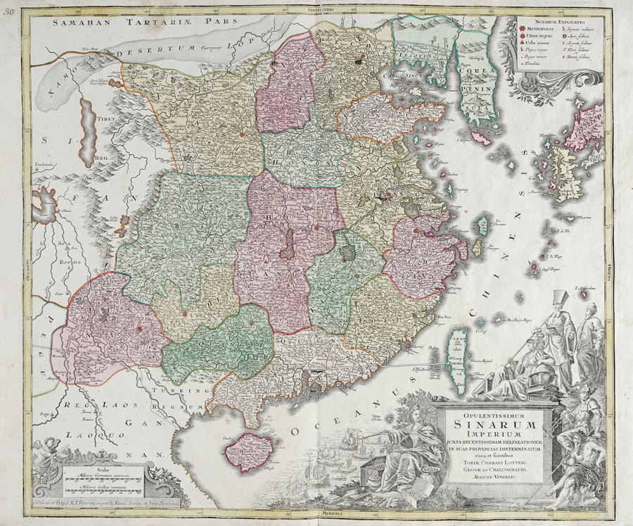 Tobias Conrad Lotter, Opulentissimum Sinarum Imperium Juxta Recentissimam Delineationem in suas Provincias Disterminatum cura et sumtibus. Augustae Vindelicorum: Tobiae Conradi Lotteri, post 1758. Incisione in rame in coloritura. mm 505x578. Foglio: mm 513x623. Grande e dettagliata mappa della Cina divisa in province ed estesa alla Corea (indicata come penisola) e alla maggior parte delle isole occidentali del Giappone. È raffigurata anche Formosa, odierna Taiwan. In basso a destra imponente cartiglio allegorico per il titolo con gli dei Atena, Ermes e Poseidone, e l'Europa che indica le navi mercantili e le ricchezze simbolo del commercio con la Cina. Sull'altro lato in basso scala metrica tedesca e francese. (1)