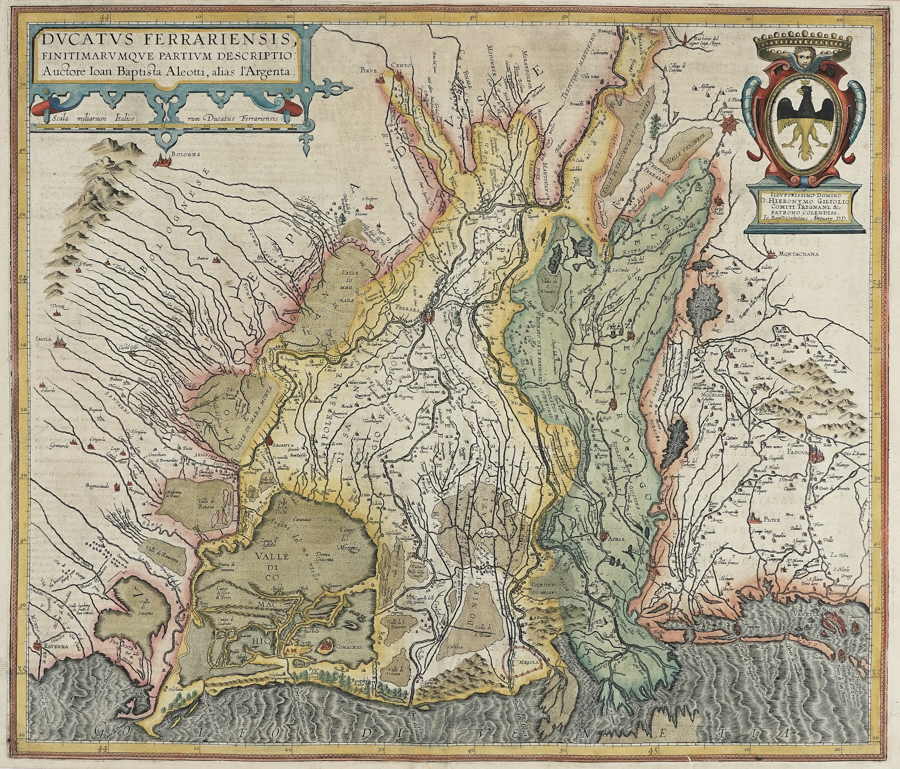 Abraham Ortelius Johannes Baptista Vrients, Ducatus Ferrariensis, Finitimarumque Partium Descriptio: Auctore Ioan. Baptista Aleotti, alias l'Argenta. Antwerp: Io. Bap.ta Vrintius, 1608-1612. Acquaforte in coloritura. mm 443x515. Foglio: mm 458x568. Testo italiano al verso. Carta del Ducato di Ferrara, comprensiva del delta del Po e di Venezia, basata su quella di Giovanni Battista Aleotti, pubblicata nel 1603. La tavola appartiene al gruppo di mappe italiane incluse solo nelle ultime edizioni del Theatrum Orbis Terrarum di Abraham Ortelius pubblicato da Johann Baptist Vrients a partire dal 1608. All'angolo in alto a destra la dedica e lo stemma di "Hieronymo Giliolio Comiti Trignani". (1)