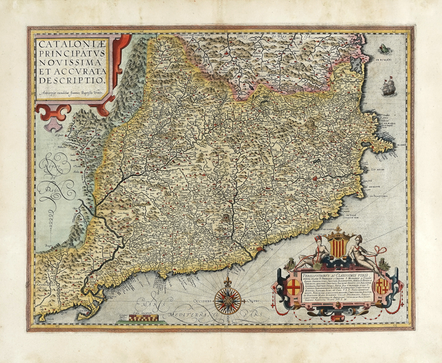 Abraham Ortelius Johannes Baptista Vrients, Cataloniae Principatus Novissima et Accurata Descriptio. Antwerp: Ioannes Baptista Vrints, 1609-1612. Incisione in rame in coloritura. mm 387x490. Foglio: mm 470x577. Testo latino al verso. Titolo in alto a sinistra entro tabella quadrata. Mappa della Catalogna preparata da Johannes Baptista Vrients per integrare l'edizione postuma del Theatrum Orbis Terrarum di Abraham Ortelius. Viene descritta la costa del Mediterraneo catalano dal fiume Ebro fino alla Francia. In evidenza Barcellona, con il Montserrat e le sue formazioni rocciose, poi con numerosissimi dettagli la descrizione si estende fino ai confini dell'Aragona e della Francia. A Nord la catena dei Pirenei. Nello specchio di mare un mostro marino, un veliero, in basso una rosa dei venti e a destra un grande cartiglio decorativo con dediche a personalità ecclesiastiche e militari, la bandiera catalana e le armi di Barcellona. (1)