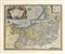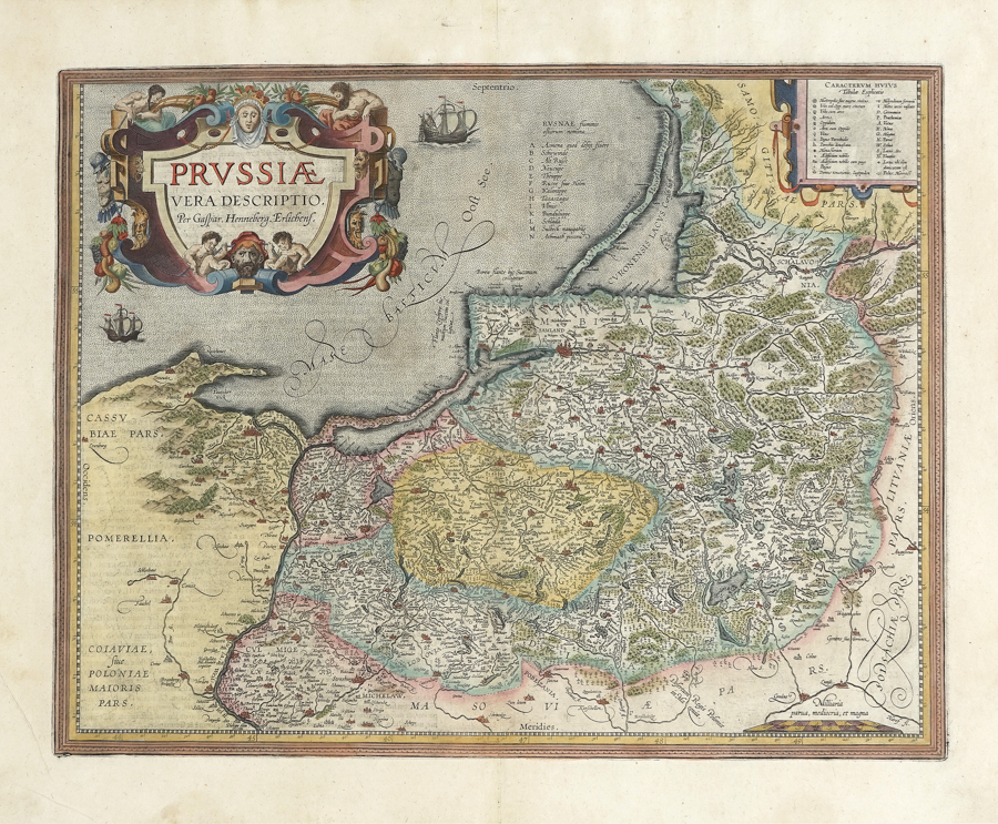 Abraham Ortelius Johannes Baptista Vrients, Prussiae vera Descriptio. Per Gaspar Henneberg. Erlichens. Antwerp: 1609-1612. Incisione in rame in coloritura. Mm 368x470. Foglio: mm 470x568. Dall'edizione latina del 1609-1612 del Theatrum Orbis Terrarum. La mappa raffigura l'Impero prussiano, corrispondente alla regione attualmente compresa tra il Nord della Polonia, la Lituania dell'ovest e l'enclave russa di Kaliningrad (qui Konigsperg). La descrizione si estende da appena ad ovest di Danzica fino ad Augustow a est. Il confine nord-est della mappa è contrassegnato con la regione della Samogitia e la città costiera lituana di Palanga. La carta di Ortelius è basata sull'opera di Caspar Henneberger (1529-1600) che realizzò una grande mappa della Prussia in xilografia pubblicata nel 1576. (1)