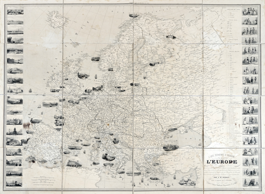 Aristide-Michel Perrot, Carte Pittoresque & Maritime de l'Europe indiquant La division des Etàts les Routes et Chemins… revue et augmentée par Alexandre Aimé Vuillemin (1812-1880). Paris: Fatout Editeur, 1845. Incisione in rame. Formato aperto: mm 900x1165. Formato chiuso. Mm 230x290. La mappa descrive l'area dall'Oceano Atlantico ai Monti Urali e dall'Oceano Artico al Mar Mediterraneo e al Nord Africa. Ogni paese è indicato con il proprio nome. Lungo il lato sinistro sono presenti 18 vignette con vedute di capitali europee, tra le quali Parigi, Londra, Vienna, Istanbul, Berlino, Madrid, Roma, Lisbona e altre. In tutta la mappa si osservano le vedute delle più importanti città portuali, inclusi centri marittimi come Cork, Edimburgo, Palma, Algeri, Palermo, Odessa e una spettacolare veduta di Costantinopoli. Una serie di 18 vignette lungo il lato destro della mappa presenta i popoli delle varie nazioni europee nei caratteristici abiti tradizionali. (1)
