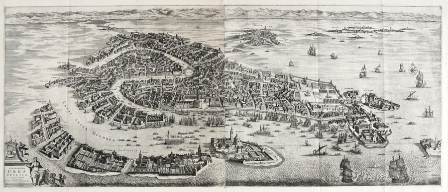 Pieter Van der Aa, Celeberrima urbs Venetiae. Lugd. Batav excudit Petrus Van der Aa, 1720 ca. Acquaforte su due lastre. mm 415x1020. Foglio: mm 470x1110. Suggestiva veduta a volo d'uccello di Venezia, pubblicata per la prima volta da Jan Jansson nel 1657. Van der Aa apportò modifiche aggiungendo un nuovo cartiglio per il titolo in basso a sinistra con il leone di San Marco, una figura femminile allegorica della città di Venezia, e due figure di mori con piccole ali rotonde. La veduta si estende fino a comprendere le vicine isole di Murano, Burano, Torcello e Mazorbo. Rappresentati con minuti dettagli i singoli edifici, la laguna, i canali percorsi da gondole e il Bucintoro in processione nel canale della Giudecca. Bellissima prova stampata con inchiostrazione brillante e grande evidenza di segno, su due fogli uniti di carta vergellata. (1)