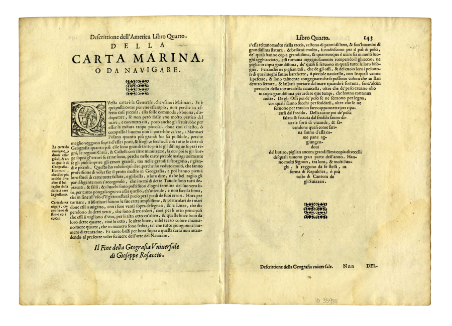 Girolamo Ruscelli, Descrittione dell'America. Libro Quarto. Carta marina nuova tavola. Venetia: Appresso gli heredi di Melchior Sessa, 1599. Incisione in rame. mm 188x262. Foglio: mm 243x348. Rara carta nautica del mondo tratta dal quarto libro della Geographia di Clavdio Tolomeo alessandrino, tradotta di Greco nell'idioma volgare Italiano da Girolamo Ruscelli ; et hora nuouamente ampliata da Gioseffo Rosaccio, con varie annotationi, & espositioni, & tauole di rame....In Venetia, MDXCIX (1599) Appresso gli heredi di M. Sessa. Questa edizione del Tolomeo di Ruscelli, riveduta, ampliata e curata da Giuseppe Rosaccio, quattro parti in un volume, comprende 69 mappe incise a doppia pagina, con cinque mappe completamente nuove, inclusa una delle Americhe. Ruscelli introduce in questo volume alcune importanti novità attraverso le sue 37 mappe "moderne", che coprono l'Europa, l'Africa, l'Asia e il Nuovo Mondo, include una mappa del mondo a doppio emisfero, la prima del suo genere a essere utilizzata in un atlante, e questa Carta Marina Nuova Tavola. (1)